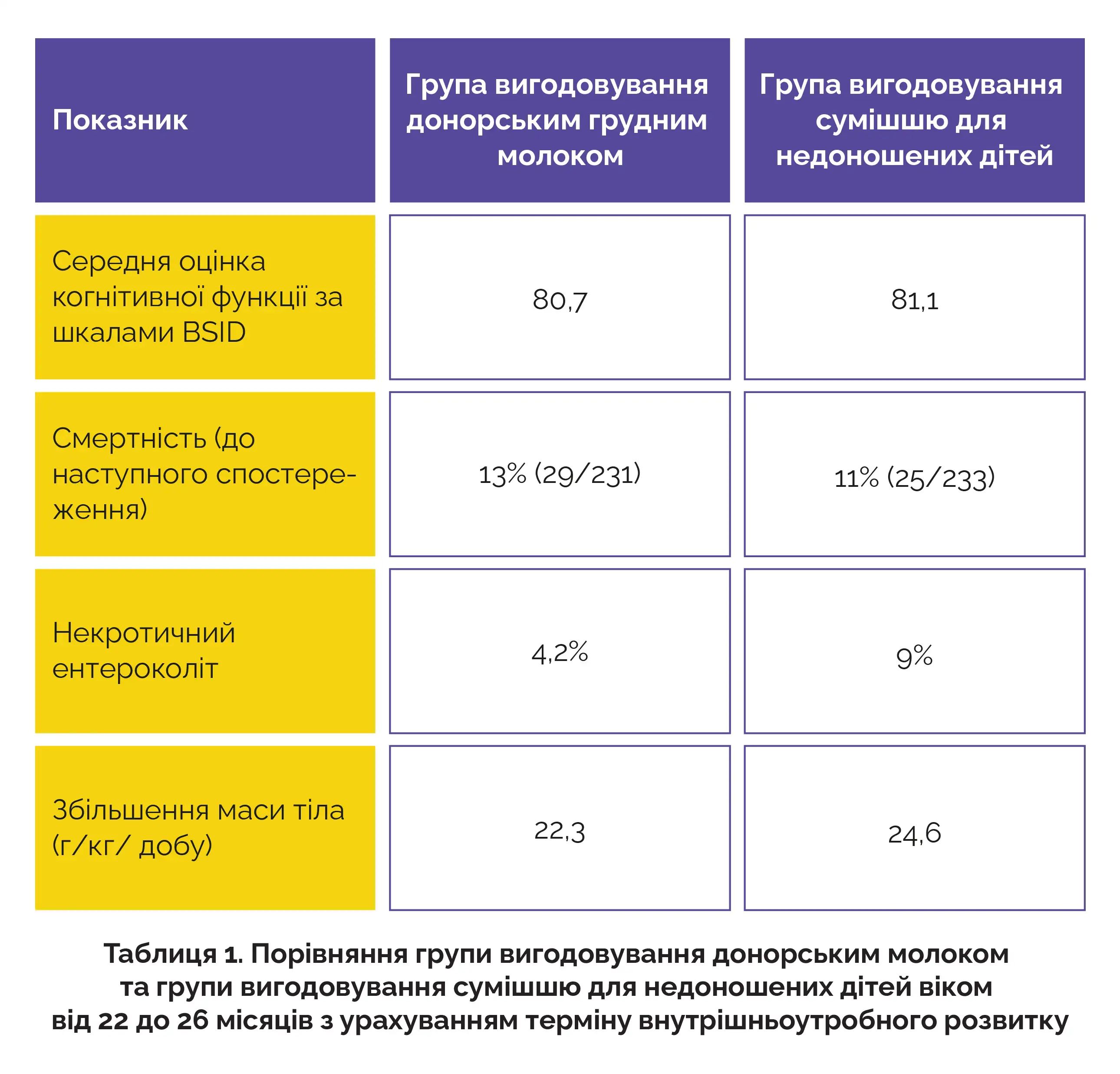 У дослідженні не було виявлено суттєвих відмінностей у когнітивному розвитку між групою вигодовування донорським грудним молоком та групою вигодовування сумішшю для недоношених дітей. Додаткові кінцеві точки, включаючи мовні та рухові навички за шкалами BSID, у групах дослідження також були подібними. Інші додаткові показники, такі як смертність, частота розвитку некротичного ентероколіту і збільшення маси тіла, докладно описані в таблиці 1 нижче.