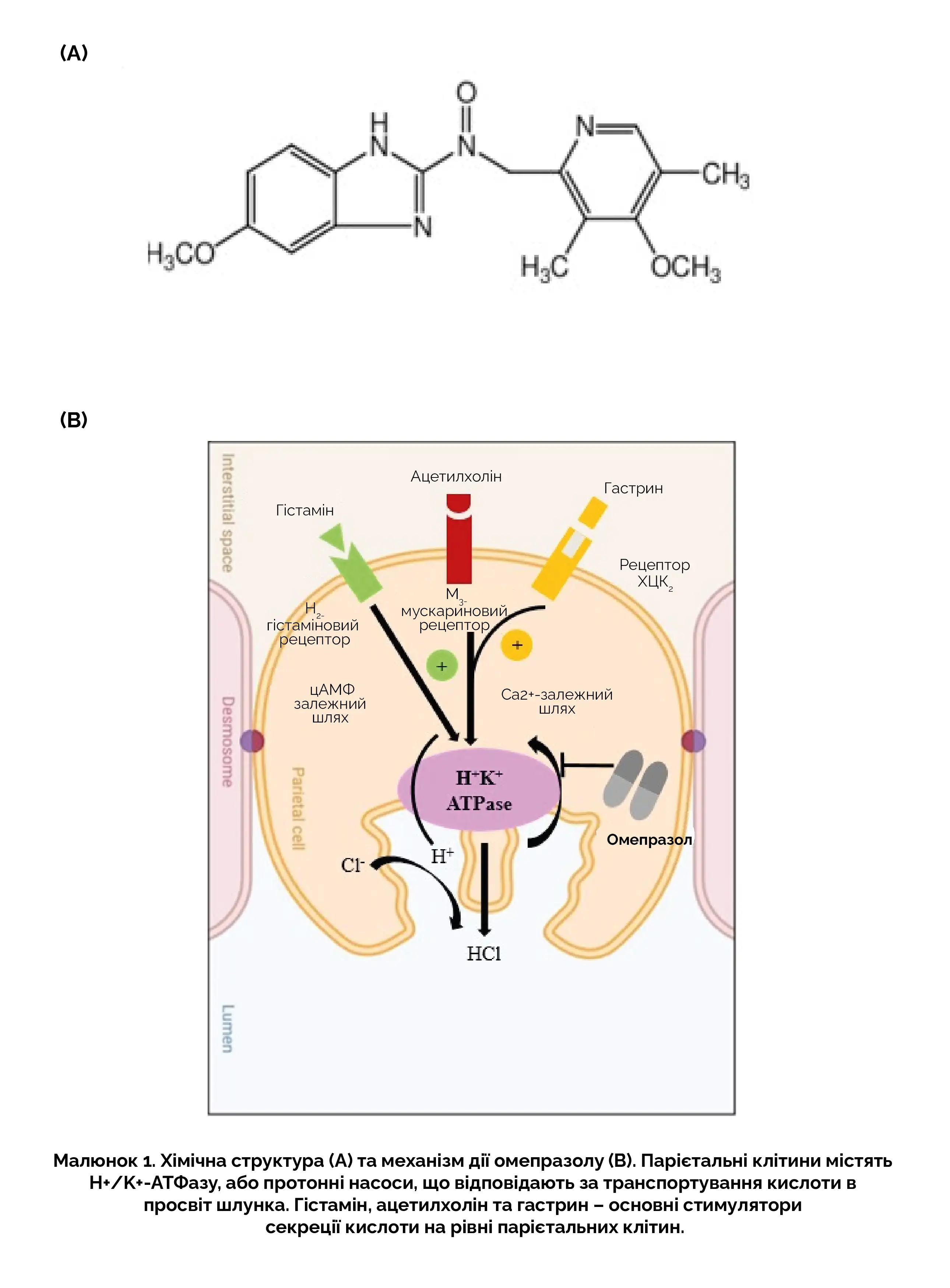 Омепразол, інгібітор протонної помпи, є слабкою основою з pKa 4,0. Після всмоктування в кишечнику він потрапляє в кровотік і досягає парієтальних клітин шлунка. Молекула омепразолу не заряджена, має pH 7 і може проходити через клітинні мембрани. Однак у секреторних канальцях активно секретують парієтальні клітини шлунка, де препарат піддається впливу pH менше 2, омепразол протонується і переходить в активну форму, сульфенамід, який ковалентно зв'язується з сульфгідрильними групами залишків цистеїну на позаклітинній поверхні альфа-субодиниці H + K + -АТФази та інгібує активність ферменту (рисунок 1).