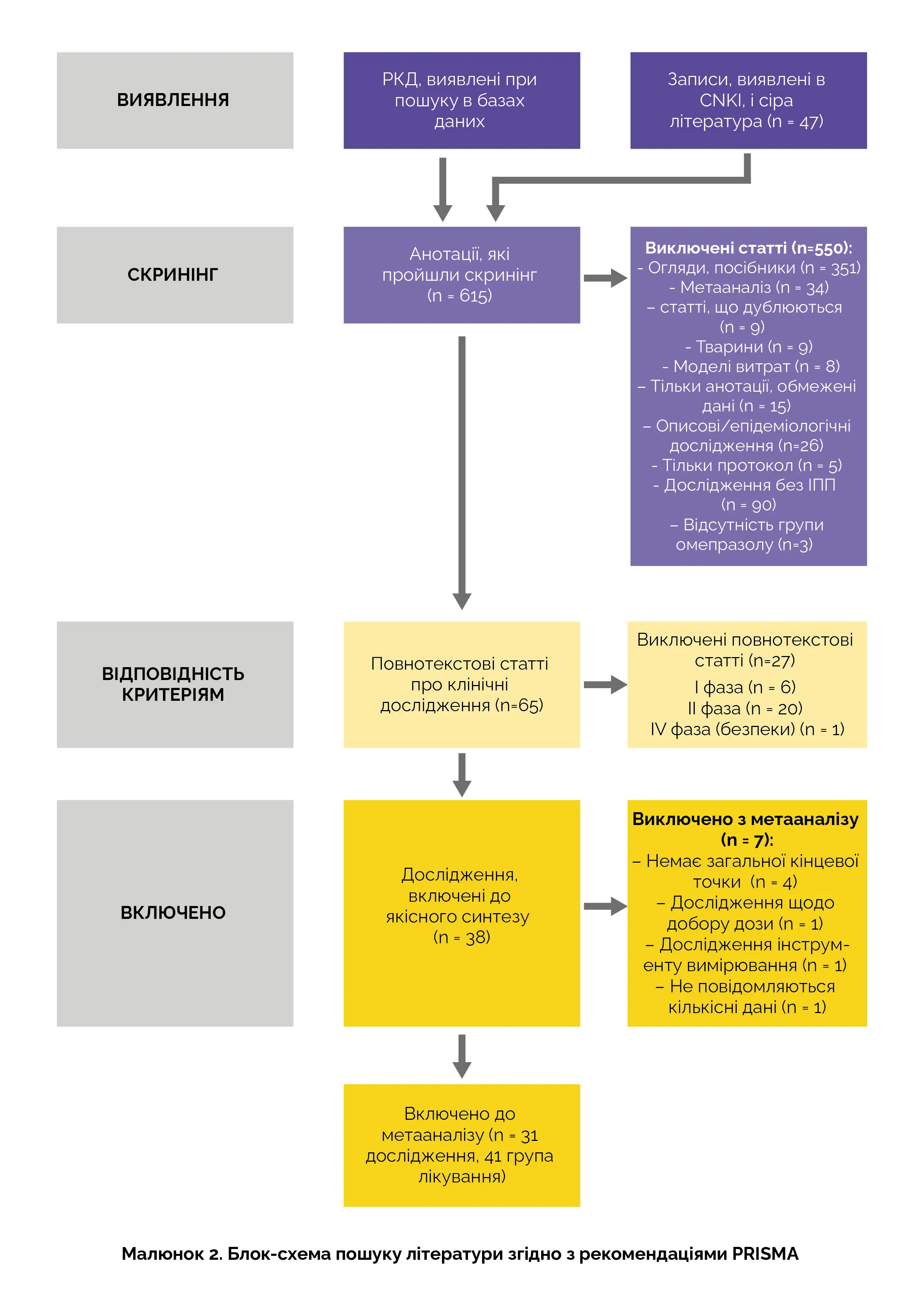 Пошук проспективних РКД, в ході яких порівнювали омепразол з іншими ІПП або плацебо, проводили в базах даних PubMed, Google Scholar та Китайської національної інфраструктури знань (CNKI) з моменту створення бази даних до 30 березня 2023 р. Як стратегію пошуку в PubMed використовували поєднання певних ключових слів: «ГЕРХ» та «омепразол» і «рандомізоване контрольоване дослідження АБО перехресне» І «ефективність» І не «прокінетики» АБО НЕ «альгінат». Крім того, списки літератури, авторів, огляди, веб-сайти з анотаціями до виступів на конференціях та https://clinicaltrials.gov для неопублікованих досліджень використовували як джерела «сірої» літератури (не індексованої в медичних базах даних). Також було проведено переклад та рецензування статей мовами, відмінними від англійської.