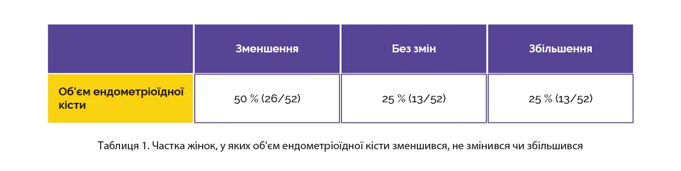Частка жінок, у яких об'єм ендометріоїдної кісти зменшився, не змінився або збільшився порівняно з вихідним рівнем до кінця 5 циклу, наведена в таблиці 1.