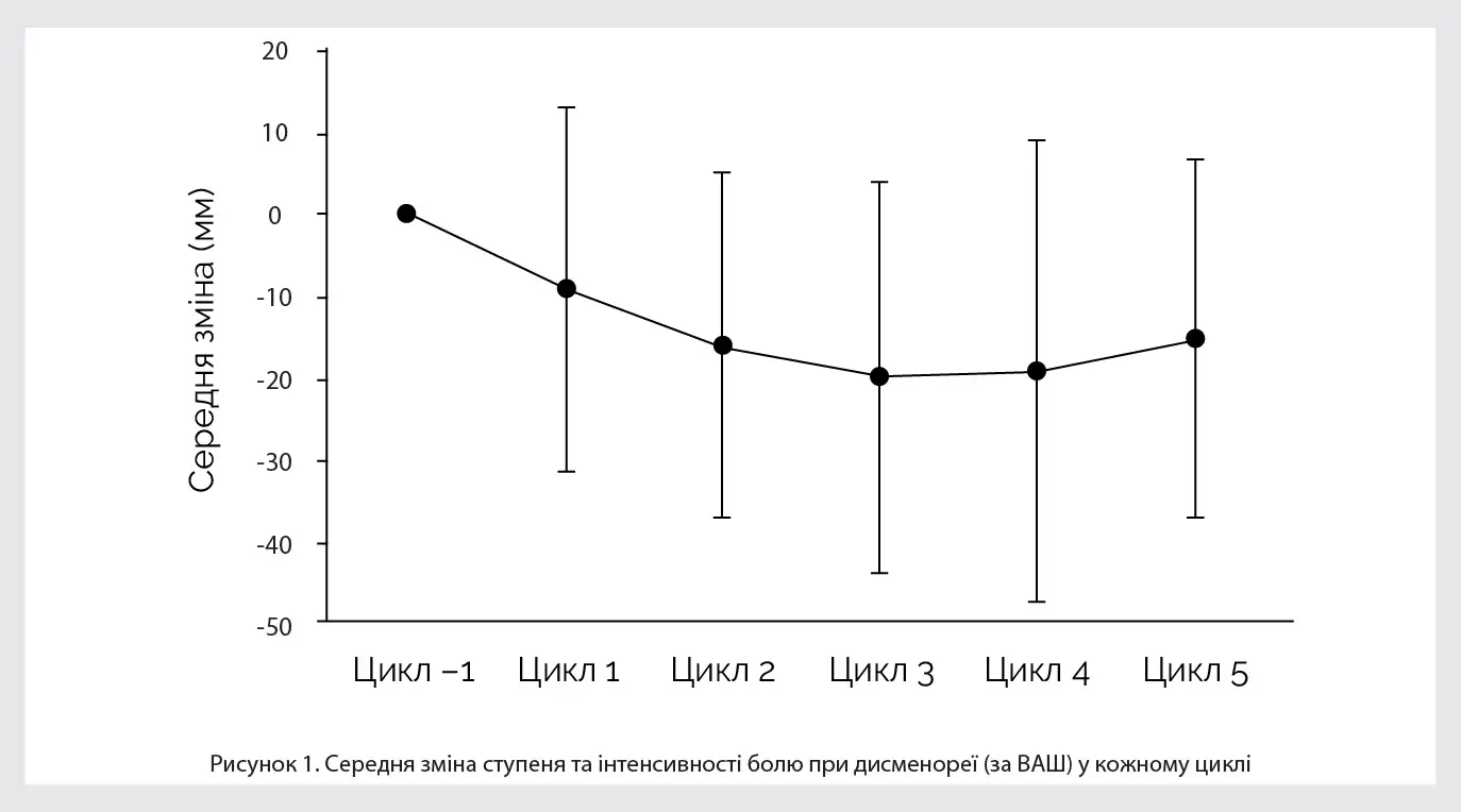 Таким чином, приблизно у трьох чвертей учасниць обсяг ендометріоїдної кісти яєчників зменшився або залишився без змін. Застосування дидрогестерону призвело до статистично значущого зниження загальної оцінки тяжкості дисменореї та виразності болю при дисменореї за ВАШ на фоні лікування порівняно з вихідним рівнем (див. рис. 1).