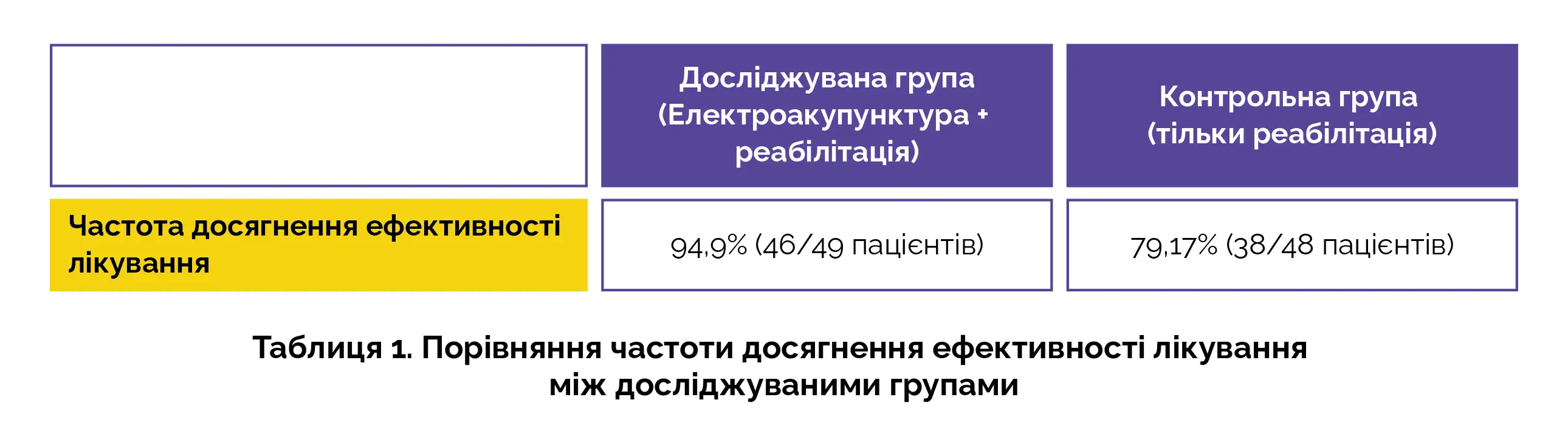 Після лікування у пацієнтів досліджуваної групи спостерігався значно вищий рівень ефективності порівняно з контрольною групою (p < 0,05) (див. таблицю 1).