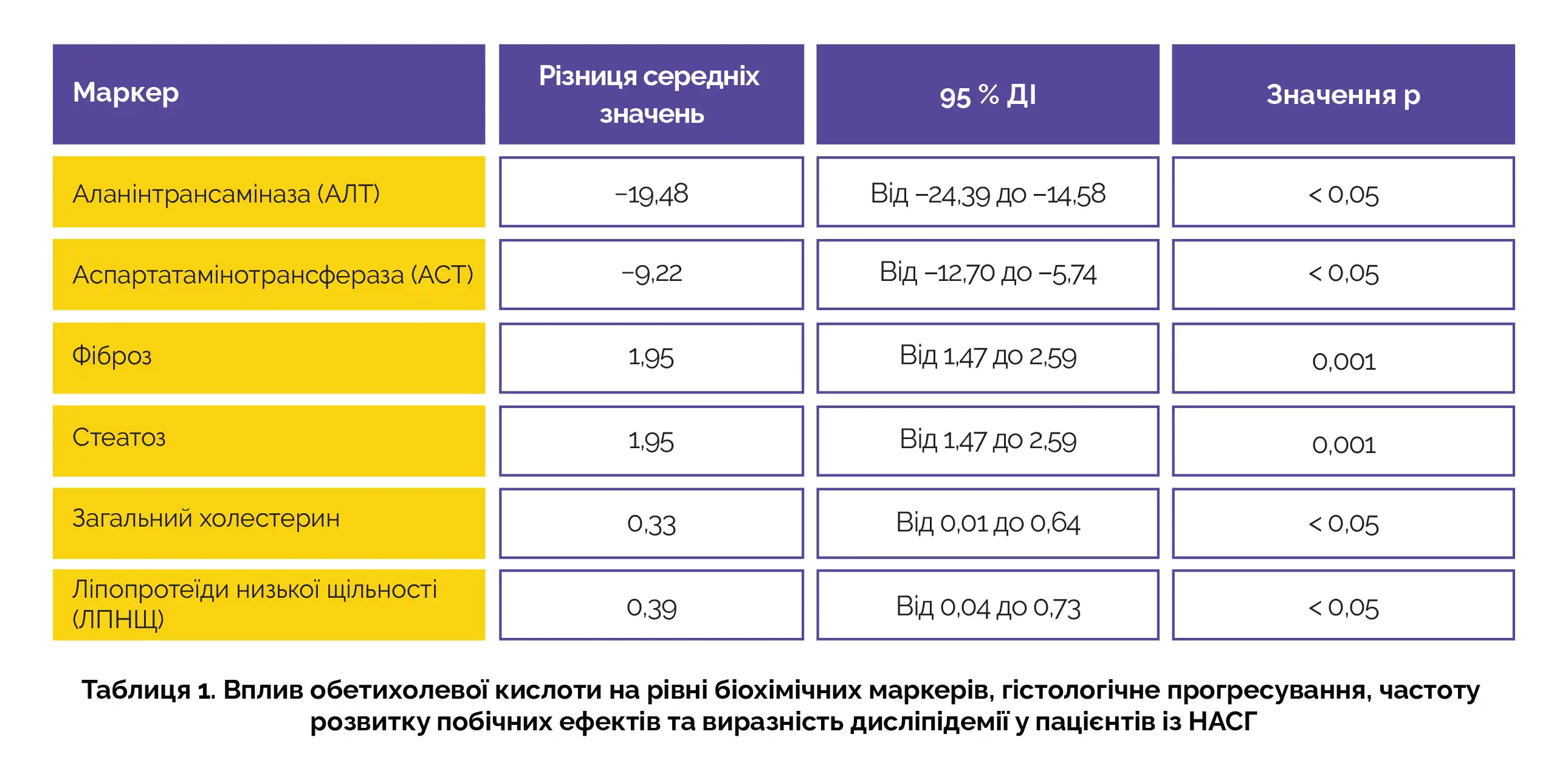 До аналізу було включено 5 досліджень. Щодо біохімічних маркерів, у пацієнтів, які отримували ОХК, спостерігалося виразне підвищення активності аланінтрансферази та аспартатамінотрансферази. З погляду гістологічного прогресування терапія ОХК забезпечувала зменшення виразності фіброзу та стеатозу. Статистично значущих відмінностей щодо побічних ефектів не спостерігалося. З точки зору виразності дисліпідемії були виявлені статистично значущі відмінності в середніх рівнях загального холестерину та ліпопротеїдів низької щільності (див. таблицю 1).