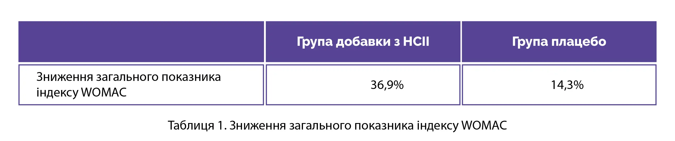 Порівняно з групою плацебо у групі прийому добавки з HCII спостерігалося статистично значуще зниження ступеня пов'язаного з суглобами дискомфорту згідно з загальним значенням індексу WOMAC та оцінками за пунктами «тугорухливості» та «фізичної активності» індексу WOMAC. У таблиці 1 подано зниження загального показника індексу WOMAC у групах дослідження через 4 тижні.
