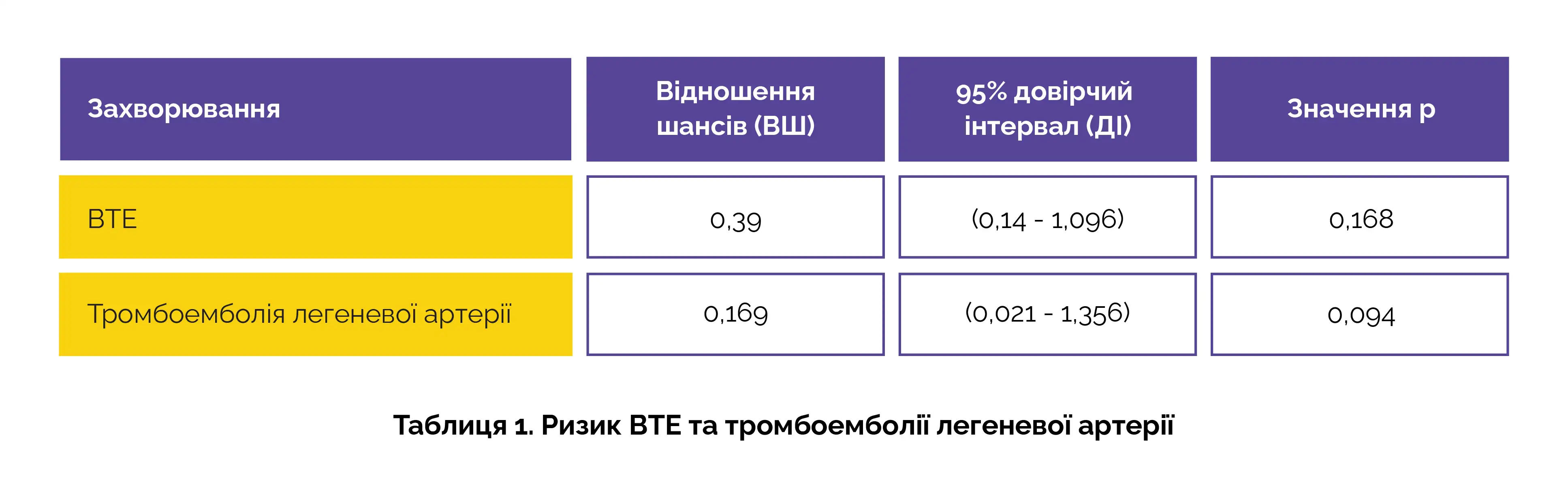 Загалом було проаналізовано дані 220 учасників із двох досліджень. У порівнянні з пацієнтами, які отримували НМГ, пацієнти, які отримували фондапаринукс, були менш схильні до розвитку венозної тромбоемболії (ВТЕ), тромбоемболії легеневої артерії та тромбозу глибоких вен (див. таблицю 1).