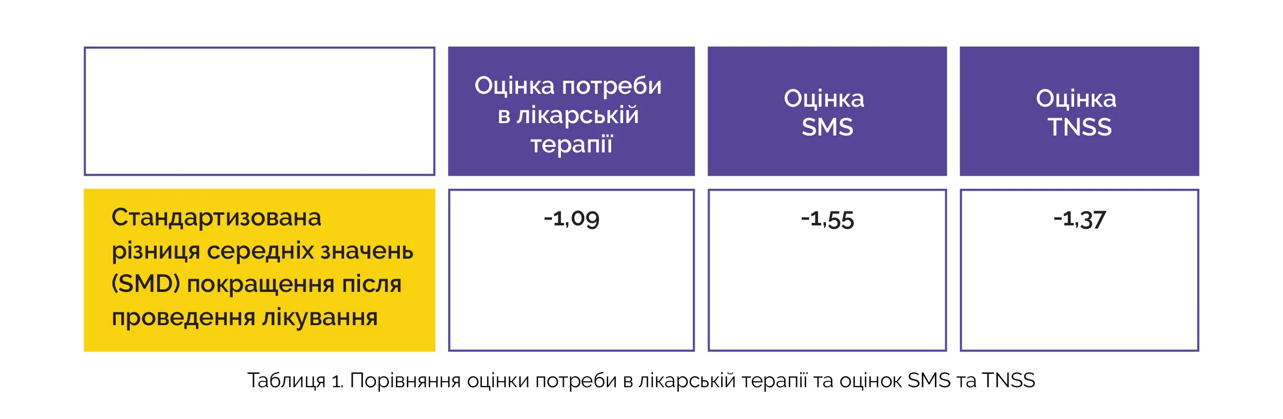 Порівняно з контрольною групою, у групі МНІТ було зареєстровано більш виражене покращення оцінки потреби у лікарській терапії, а також оцінок SMS та TNSS (див. таблицю 1).
