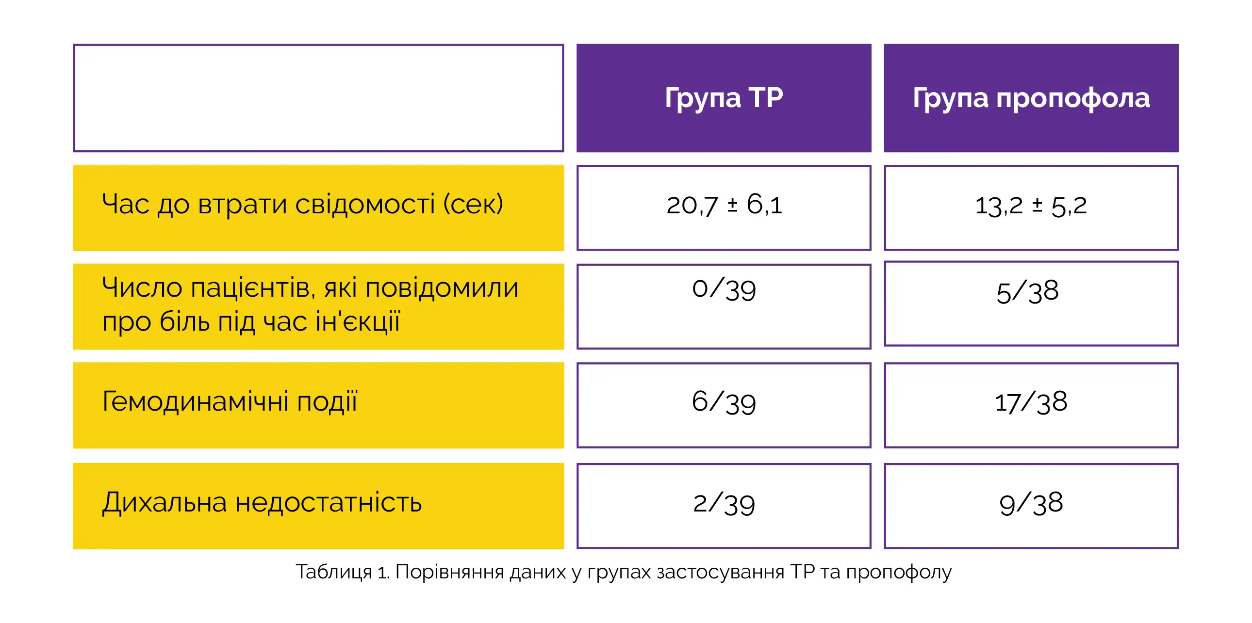 До аналізу було включено дані 77 учасників. В обох групах процедура седації була успішною (100%). У групі застосування ТР показник часу до втрати свідомості (оцінка MOAA/S - 1) був вищим, ніж у групі застосування пропофолу. У порівнянні з учасниками групи застосування пропофолу, пацієнти з групи застосування ТР рідше повідомляли про випадки болю під час ін'єкції препарату. У групі застосування ТР частота розвитку дихальної недостатності та гемодинамічних подій була нижчою порівняно з групою застосування пропофолу (див. таблицю 1).