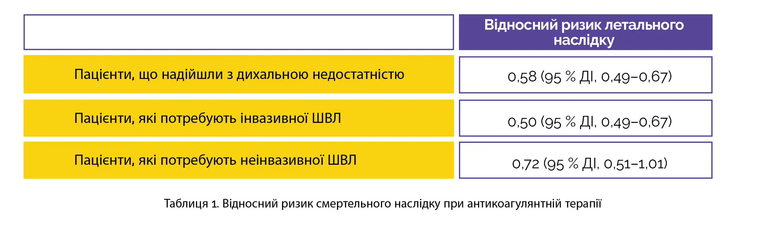 Антикоагулянтна терапія, проведена під час госпіталізації, була пов'язана зі зниженням частоти смертельних наслідків (32 % порівняно з 42 %) та з підвищеним ризиком кровотеч, який не був статистично значущим (3,4 % порівняно з 2,7 %). пацієнтів, які надійшли з респіраторною недостатністю. У таблиці 1 наведено відомості про відносний ризик смертельних випадків після проведення антикоагулянтної терапії у пацієнтів, які надійшли до лікувального закладу з респіраторною недостатністю та потребували інвазивної або неінвазивної штучної вентиляції легень.