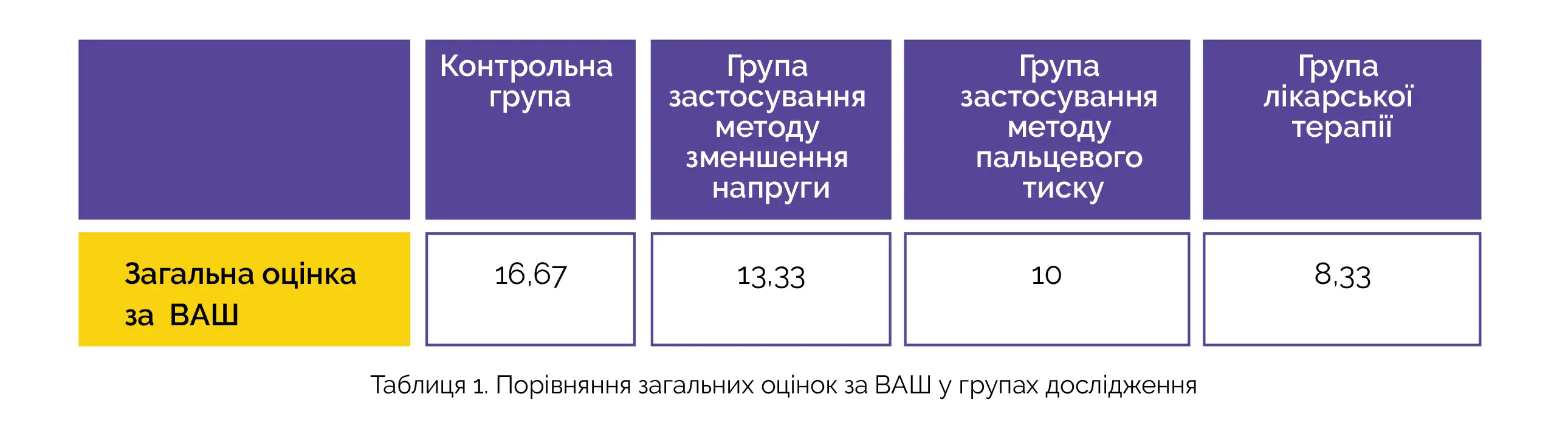 У всіх групах оцінка за ВАШ була вищою у нижньому та верхньому передніх секстантах ротової порожнини. У порівнянні з чоловіками, у жінок відзначалися статистично значуще вищі оцінки за ВАШ, і зокрема у верхньому передньому секстанті. При парному порівнянні були виявлені статистично значущі відмінності в загальній оцінці ВАШ між групою застосування методу пальцевого тиску та контрольною групою, групами застосування методу зменшення напруги та лікарської терапії, а також контрольною групою та групою лікарської терапії. Тим не менш, відмінність загальних оцінок ВАШ між групами застосування методу пальцевого тиску та лікарської терапії не була клінічно значущою.