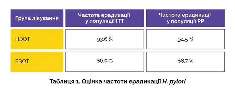 В рамках аналізу, виходячи з припущення, що всі пацієнти отримали втручання (ITT), і аналізу даних усіх пацієнтів, які завершили лікування у відповідності до протоколу (PP), частота ерадикації через 14 днів у групах істотно не відрізнялася (див. таблицю 1).