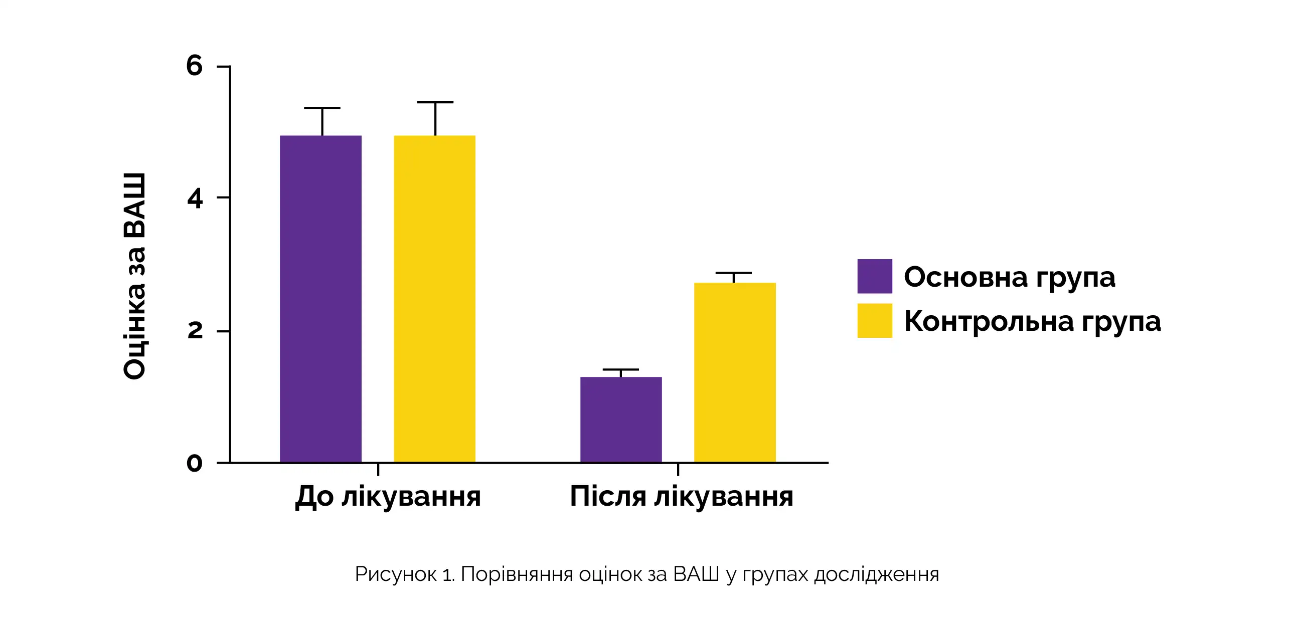 Оцінка за ВАШ у групах дослідження на початок лікування статистично значуще не відрізнялася. Однак після проведення лікування оцінка за ВАШ в основній групі знизилася порівняно з контрольною групою (див. рисунок 1).