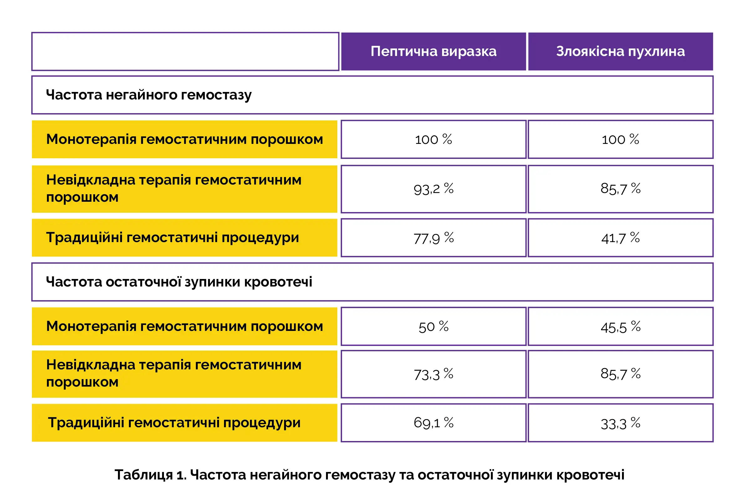 Найчастішими причинами кровотечі були злоякісні новоутворення та пептичні виразки. Дані про частоту негайного гемостазу та остаточної зупинки кровотечі при проведенні монотерапії та невідкладної терапії гемостатичним порошком, а також традиційних гемостатичних процедур наведено в таблиці 1.