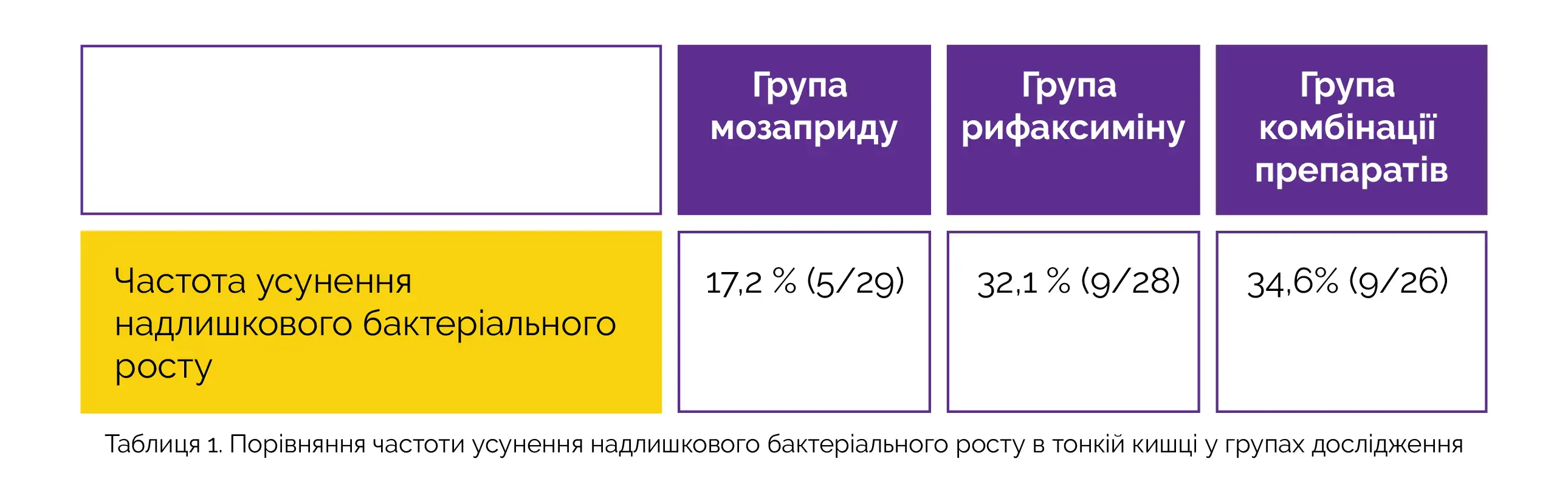 Було проведено рандомізоване дослідження з метою оцінки ефективності застосування рифаксиміну, мозаприду та комбінації рифаксиміну з мозапридом у рамках корекції надлишкового бактеріального росту в тонкій кишці.