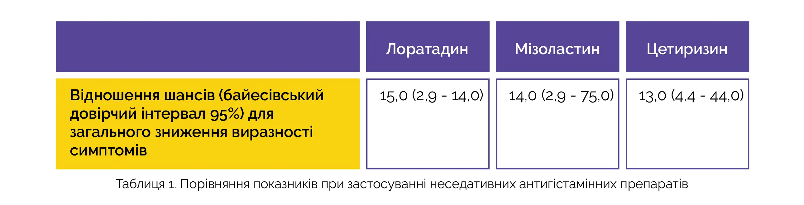 Було встановлено, що у пацієнтів з хронічною спонтанною кропив'янкою лоратадин є найбільш ефективним неседативним антигістамінним препаратом, за яким слідують мізоластин та цетиризин. Дані про відношення шансів для загального зниження симптомів після 4 тижнів терапії наведено в таблиці 1.