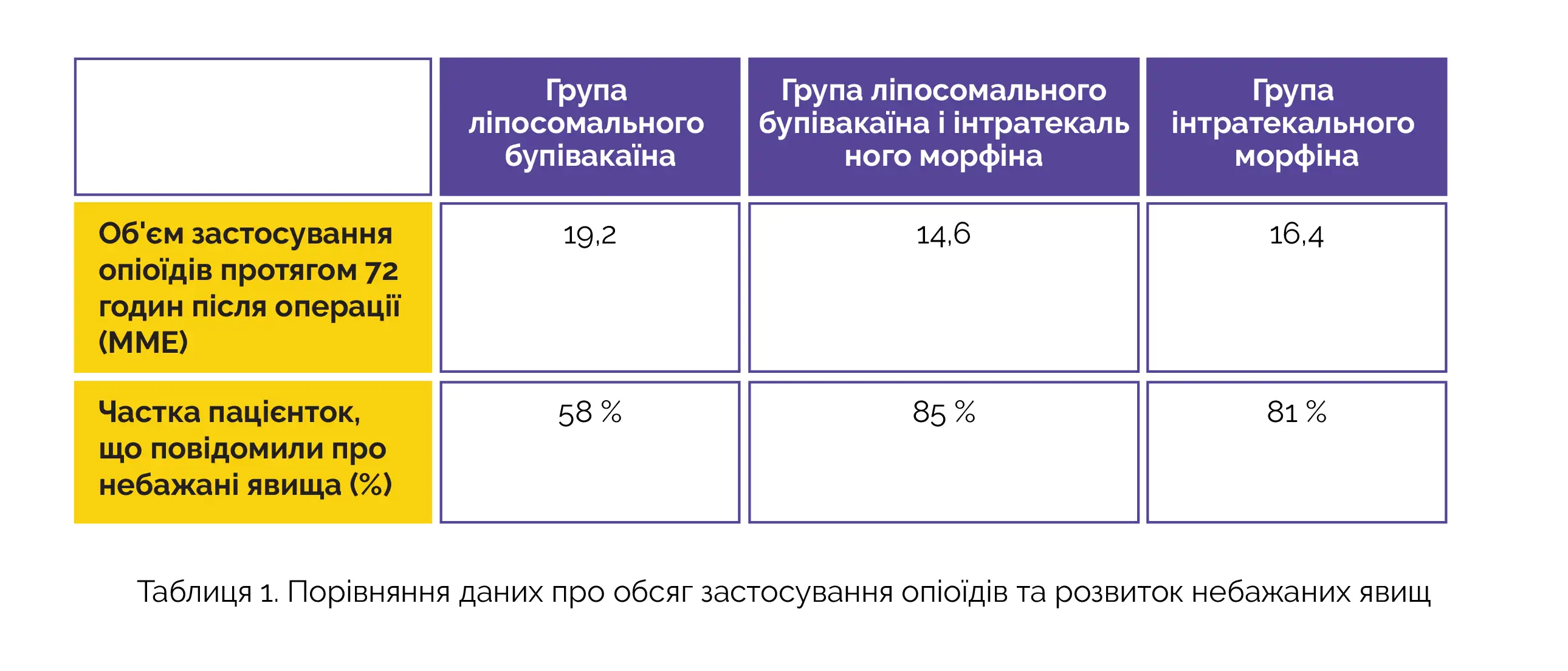 За показником обсягу застосування опіоїдів протягом 72 годин після операції у групі ліпосомального бупівакаїну спостерігалася не менша ефективність порівняно з двома іншими групами. Дані про частоту розвитку небажаних явищ представлені у таблиці 1.