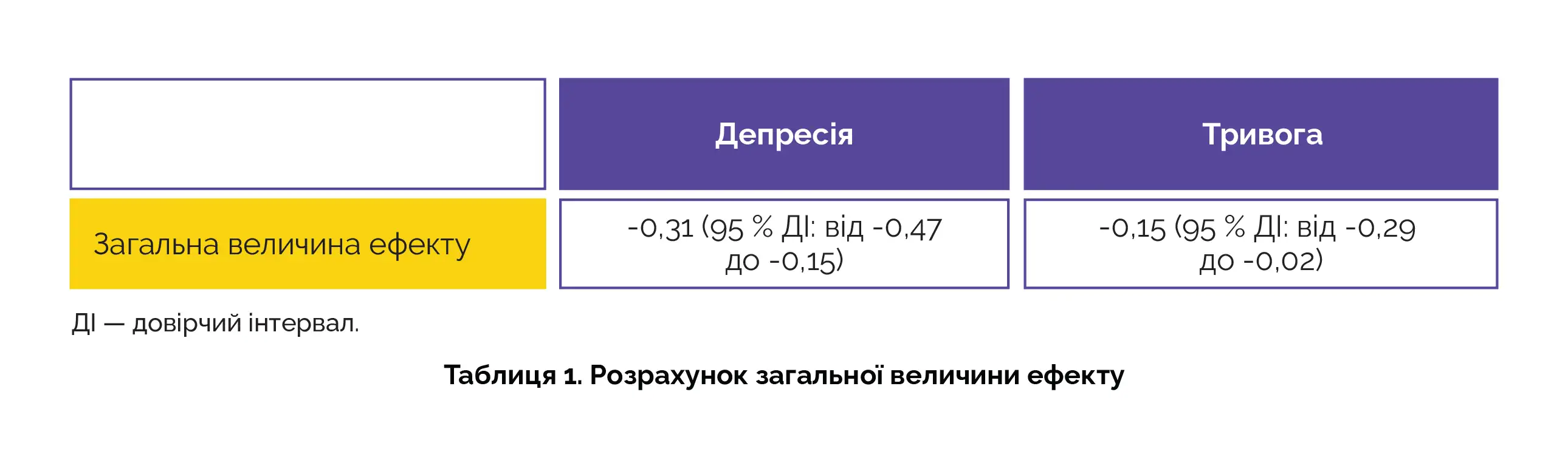 Було відібрано 17 публікацій, з яких у 4 публікаціях безпосередньо оцінювали ефективність терапії прийняття та відповідальності. Демографічні характеристики у всіх включених вибірках були зіставні. Загальна величина ефекту для депресії та тривоги досягла порога статистичної значущості (див. таблицю 1).