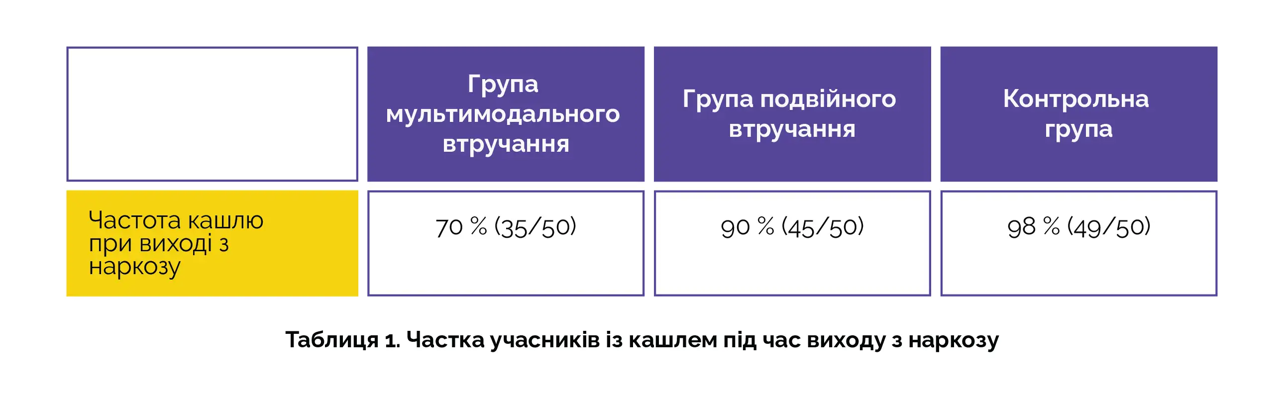 У групі мультимодального втручання була відзначена статистично значуще нижча частота кашлю під час виходу з наркозу в порівнянні з групою подвійного втручання (відносний ризик 0,78; 95% ДІ 0,63-0,95; p = 0,012) і з контрольною групою (відносний ризик 0,71; 95% ДІ 0,59-0,86; p < 0,001) (див. таблицю 1).