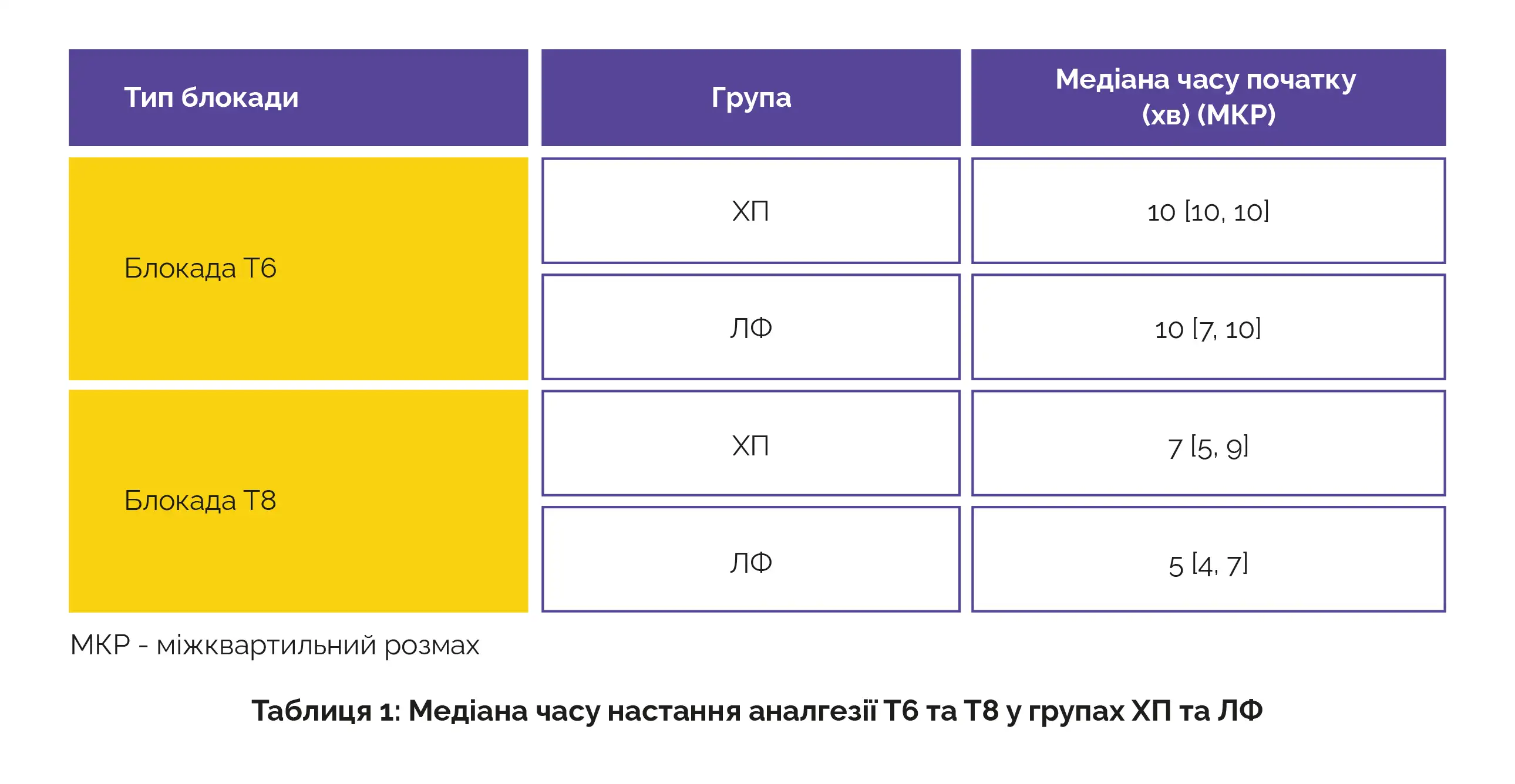 Середні значення часу настання блокади Т6 та Т8 при епідуральній анестезії під час кесаревого розтину наведено в таблиці 1: