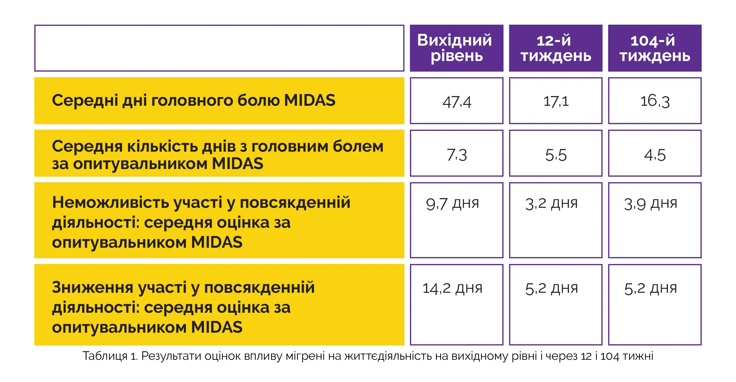 Порівняно з вихідним рівнем, через 12 та 104 тижні середня кількість днів з головним болем за опитувальником MIDAS, середня інтенсивність головного болю, середня оцінка неможливості участі у повсякденній діяльності за пунктами опитувальника MIDAS (питання 1, 3 та 5) та середня оцінка зниження участі у повсякденній діяльності за пунктами опитувальника MIDAS (питання 2 та 4) знизилися (див. таблицю 1).