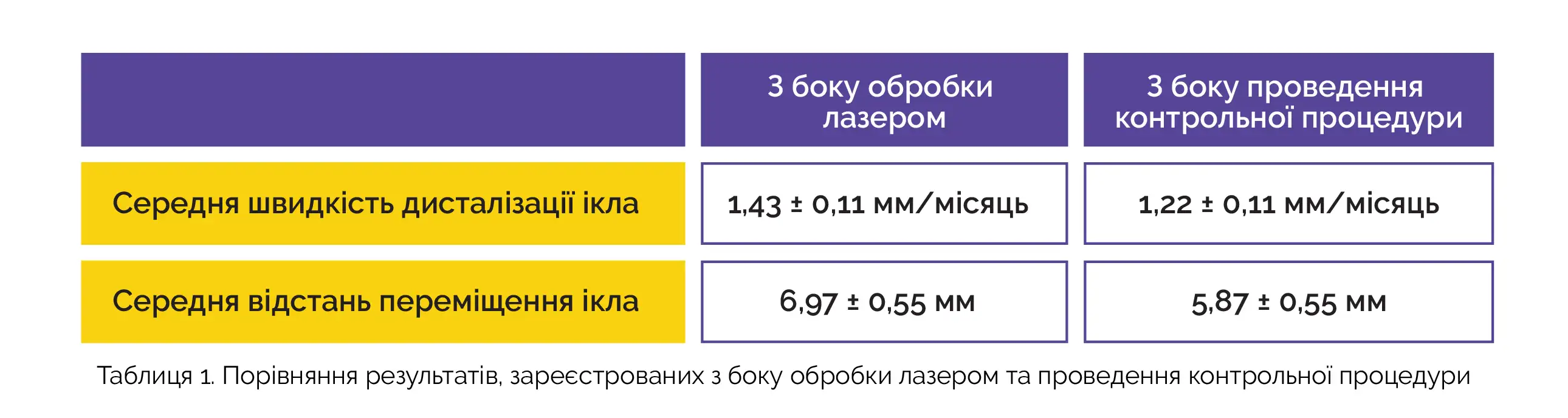 Дані про середню відстань переміщення та середню швидкість дисталізації іклів з боку обробки лазером та з боку проведення контрольної процедури наведені в таблиці 1.