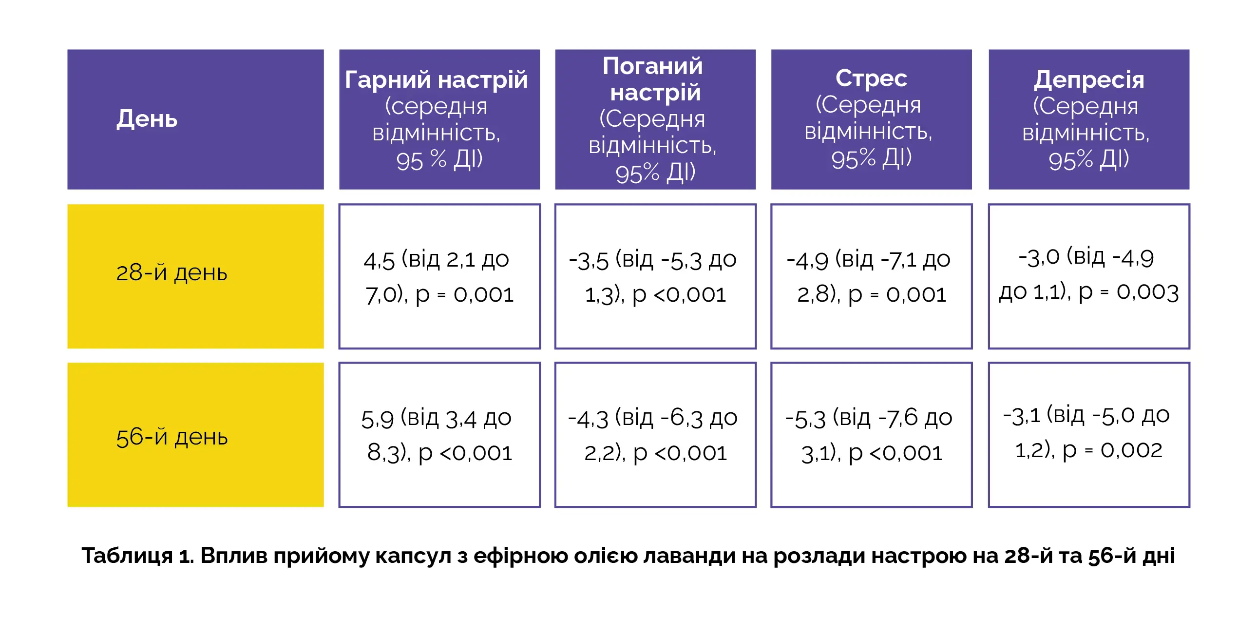 Між жінками, які отримували капсули з ефірною олією лаванди та плацебо, були виявлені статистично значущі відмінності у розладах настрою. Вплив прийому капсул з ефірною олією лаванди на настрій та психічне здоров'я відображено у таблиці 1.