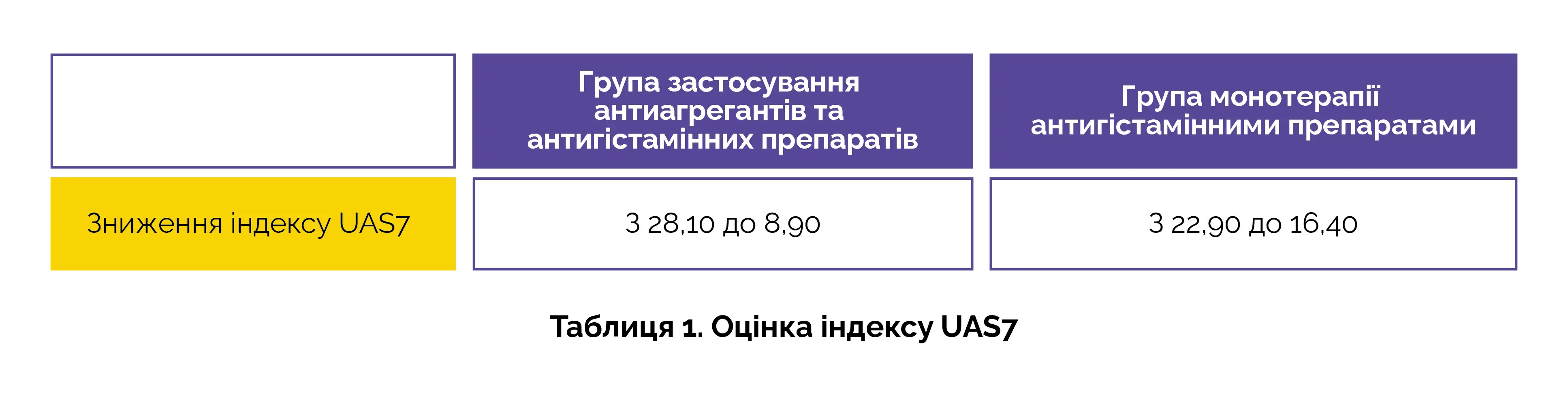 У групі застосування антиагрегантних та антигістамінних препаратів спостерігалося більш виражене зниження індексу UAS7 порівняно з контрольною групою (група монотерапії антигістамінними препаратами) (див. таблицю 1).