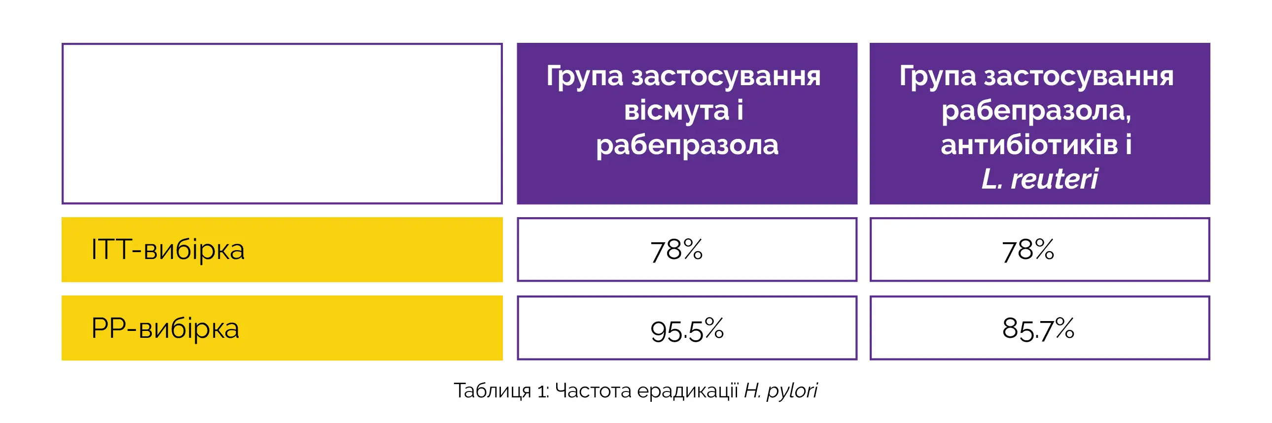 Дані про частоту ерадикації H. pylori в популяції пацієнтів залежно від призначеного втручання (ITT-популяція) та в популяції усіх пацієнтів, які завершили лікування у відповідністі до протоколу (PP-популяція), наведено в таблиці 1.