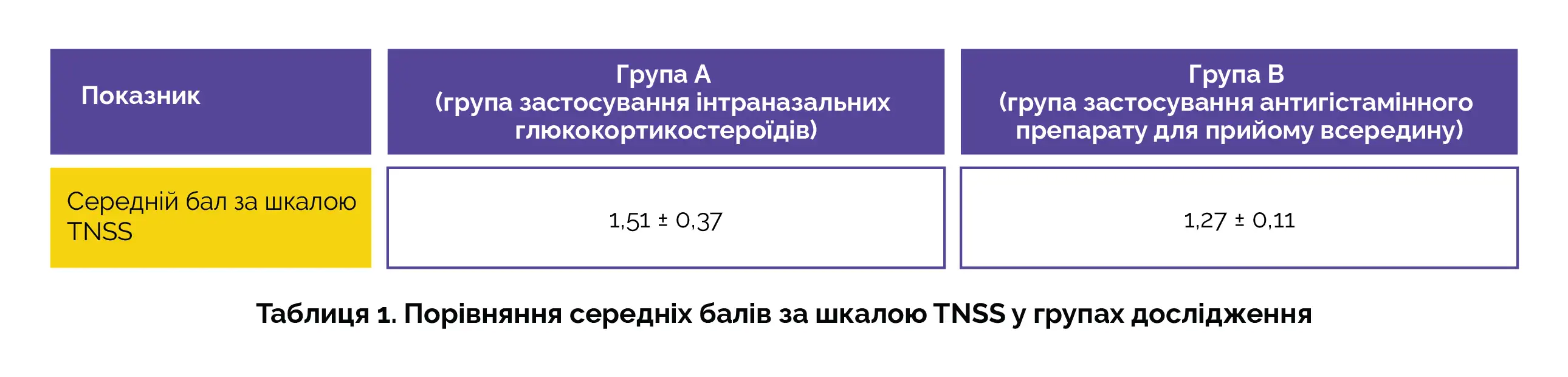 Середні бали за шкалою TNSS при застосуванні ІнГКС та антигістамінних препаратів для внутрішнього застосування наведені в таблиці 1.