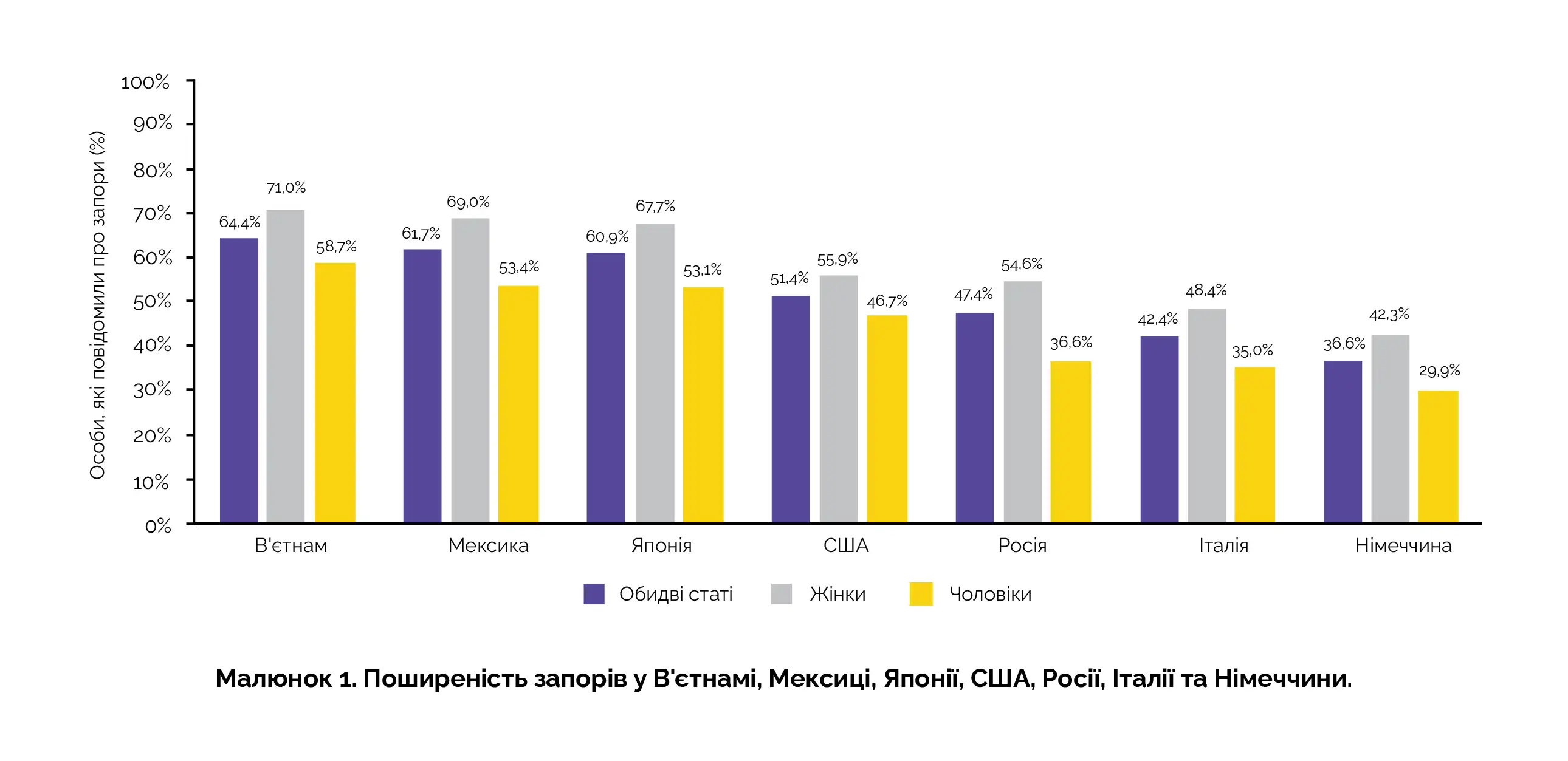 Загалом про запори, що продовжуються протягом 6 місяців, повідомляли 10 425 осіб, а у 2637 осіб запори відзначалися вперше. Висока частота запорів (за власною оцінкою пацієнтів) спостерігалася у всіх країнах, при цьому жінки та молоді люди частіше повідомляли про цей стан (рисунок 1):