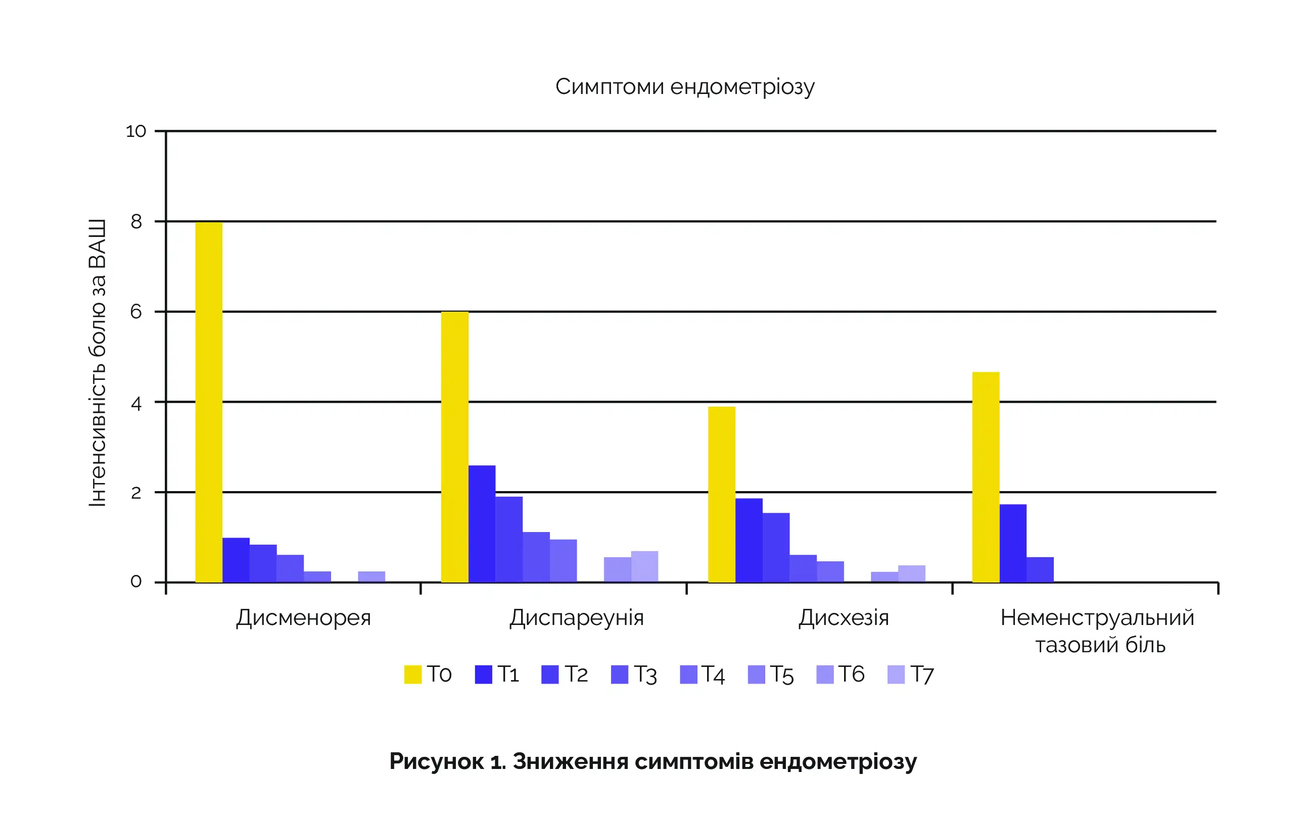 Отримані результати свідчили про поступове зменшення розмірів великих ендометріом (з 33,2 мм до 7 мм через 108 місяців лікування). Крім того, спостерігалося статистично значуще зниження виразності дисхезії, диспареунії, дисменореї та тазового болю нециклічного характеру (див. рисунок 1).