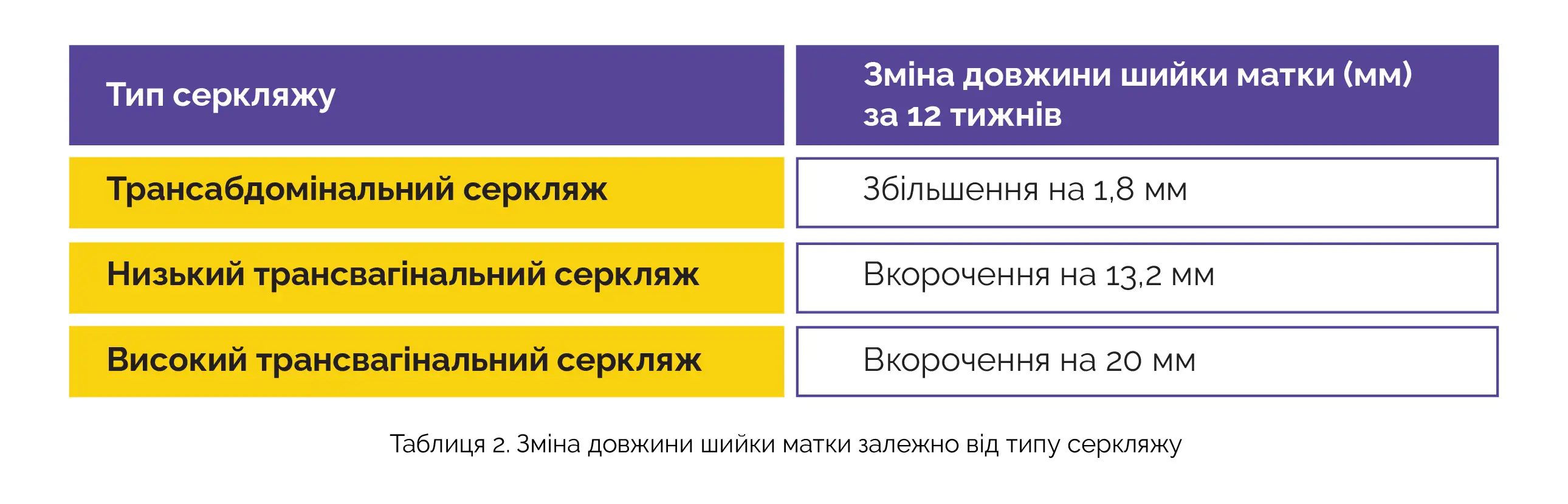 Щодо профілактики укорочування шийки матки високий трансвагінальний серкляж не мав значних переваг проти низького цервікального серкляжу. За 12 тижнів шийка матки вкоротилася на 13,2 мм у пацієнток після низького трансвагінального серкляжу (95 % довірчий інтервал: від -21,7 до -4,7) та на 20 мм у пацієнтів після високого трансвагінального серкляжу (95 % довірчий інтервал: від -33,1 до -7,4) (див. таблицю 2).
