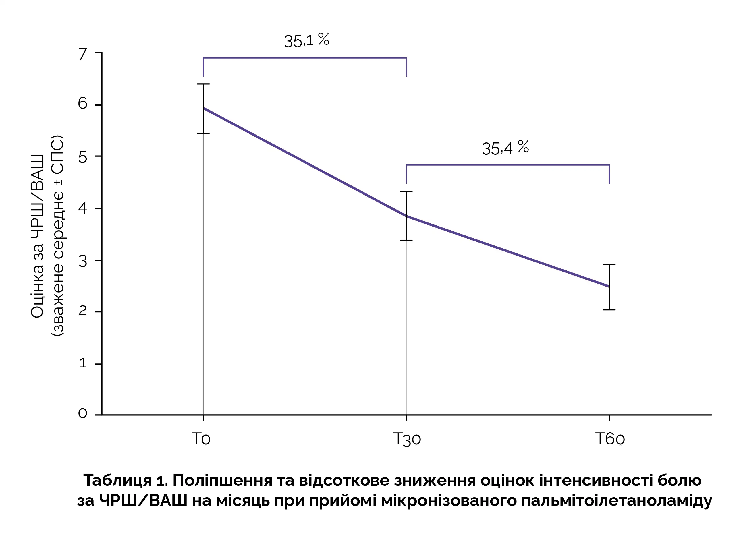 Згідно з результатами метааналізу, при прийомі мікронізованого пальмітоілетаноламіда протягом 60 днів спостерігалося значно більш виражене зниження оцінок інтенсивності болю проти 30 днями (зниження на 1,36 бала, p <0,01 ). Результати вторинного аналізу свідчать про зниження на 2,08 бали оцінок ЧРШ/ВАШ протягом першого місяця, що відповідає зниженню інтенсивності болю на 35,1 %. Це поліпшення супроводжувалося подальшим зниженням на 35,4% протягом другого місяця лікування (рисунок 1).