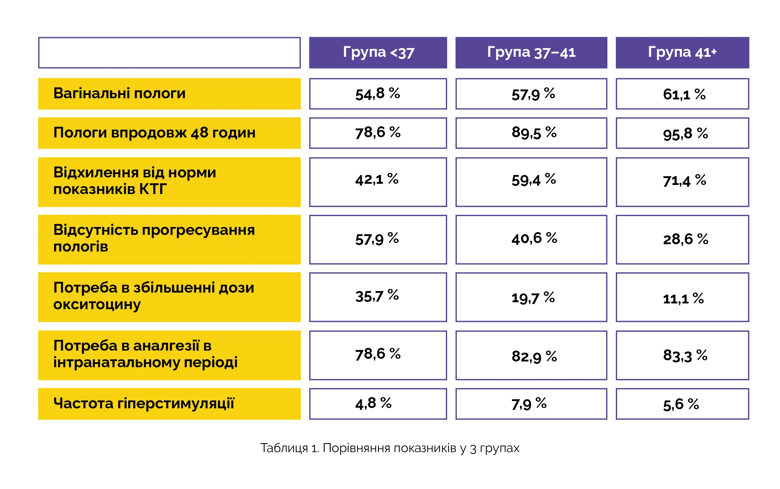 Потреба збільшення дози окситоцину була статистично значуще нижче в групі 41+. Потреба аналгезії в інтранатальному періоді варіювалася в різних групах, причому більш висока потреба відзначалася в групі 41+. Частота гіперстимуляції була порівнянною у всіх трьох групах (таблиця 1).