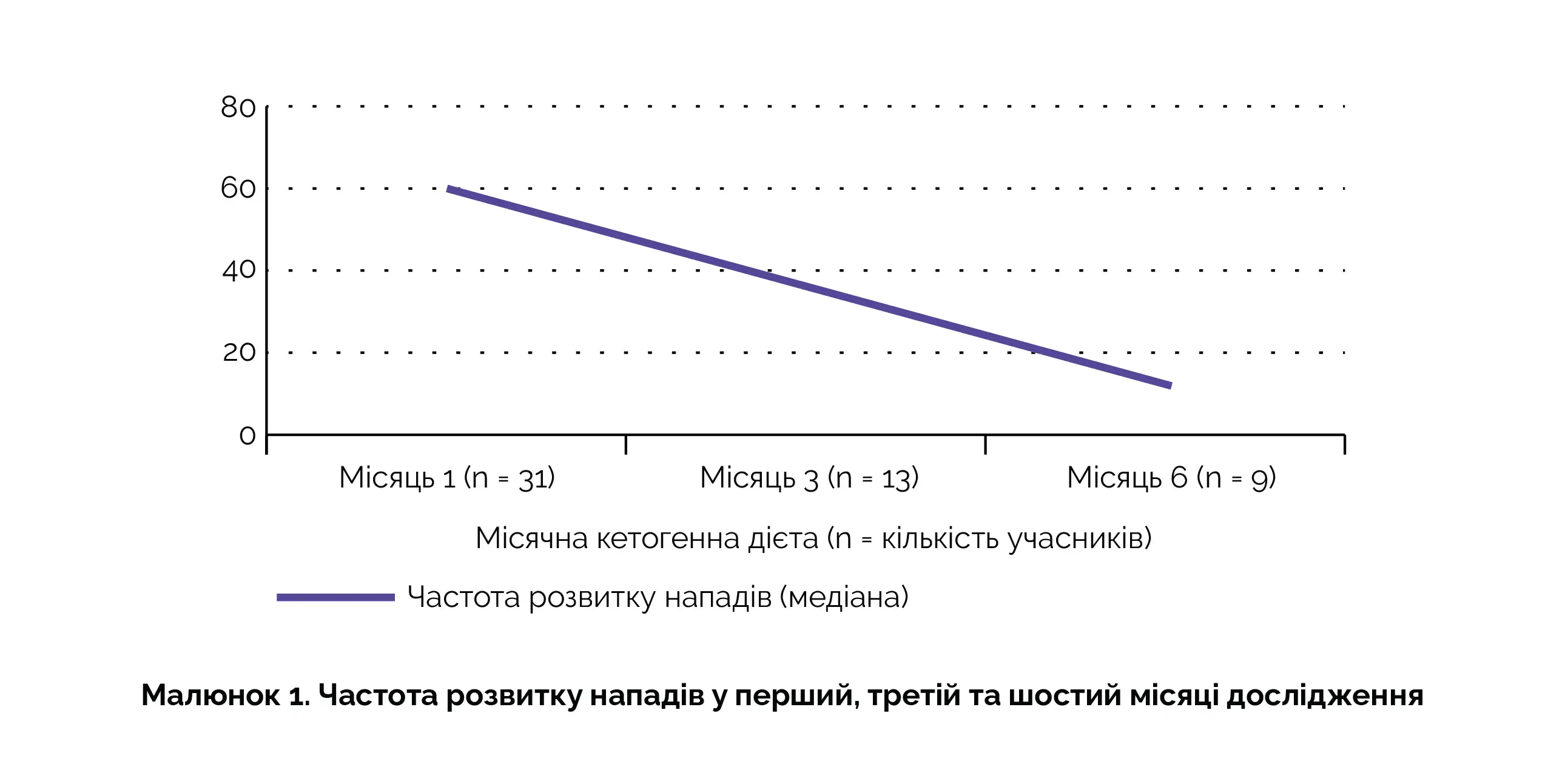 Усі учасники, які відповідають критеріям відбору (n = 31), дотримувалися МДА протягом одного місяця; при цьому 41,9% продовжували дотримуватися МДА протягом трьох місяців, а 29% - протягом шести місяців. Було відзначено помітне зниження частоти розвитку нападів: 50% у перший місяць, 62% у третій місяць та 83,3% у шостий місяць, як показано на малюнку 1.