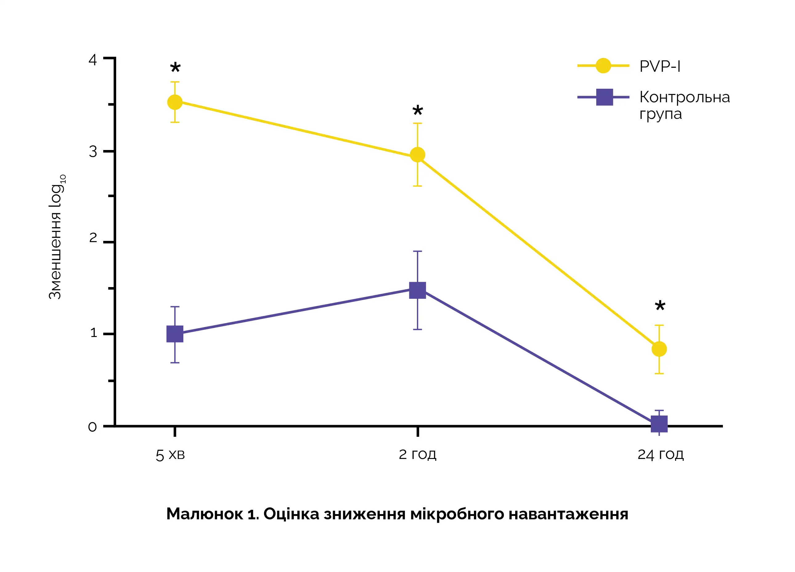 На початковому рівні спостерігалася виражена кореляція між анаеробними видами бактерій, Dolosigranulum species, Corynebacterium та Staphylococcus . Після нанесення розчину PVP-I відзначалося значне зниження мікробного навантаження: log 10 3538 ± 0918 через 5 хвилин; log 10 2,961 ± 1,466 через 2 години та log 10 0,849 ± 1,092 через 24 години (p < 0,01) (див. рисунок 1).