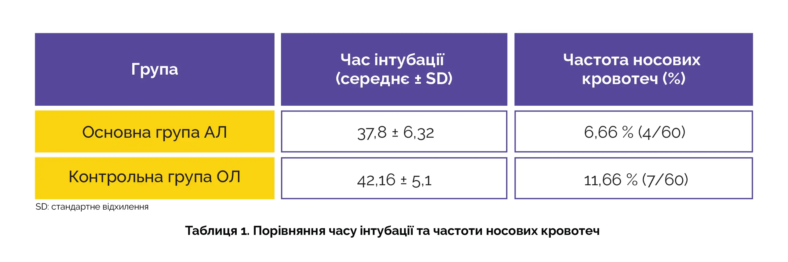 Розпилення АЛ перед назотрахеальною інтубацією призводило до значного скорочення часу інтубації порівняно з контрольною групою. Цей результат відповідав частішому виникненню помірних носових кровотеч у групі АЛ у порівнянні з групою ЕЛ (таблиця 1).