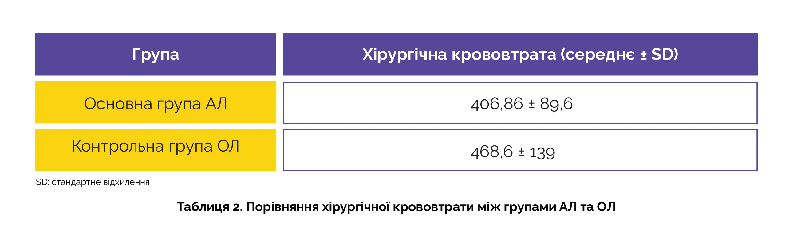 Група АЛ продемонструвала більший потенціал зниження операційної крововтрати порівняно з групою ОЛ (таблиця 2).