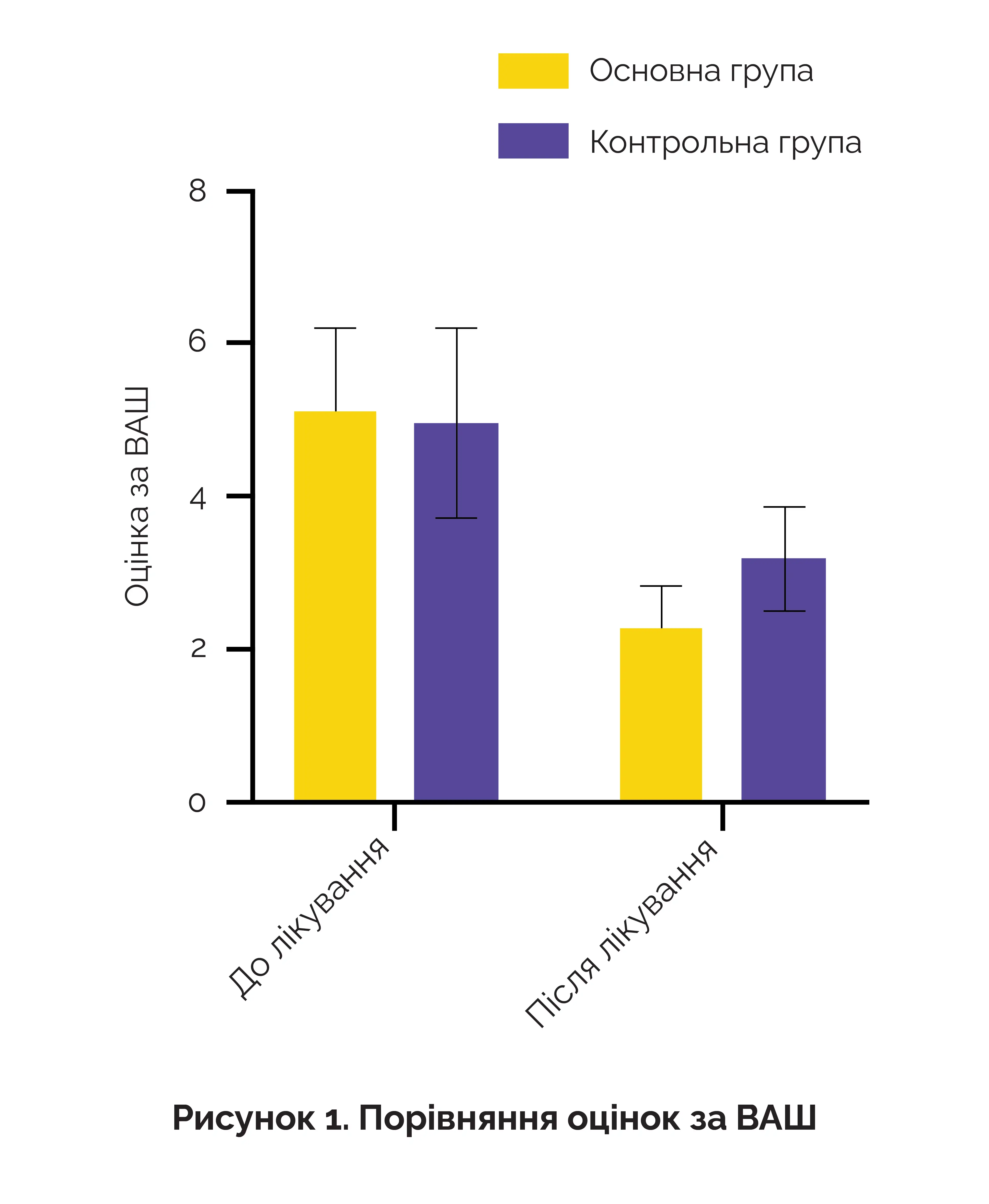 У досліджуваній групі загальна частота відповіді була значно вищою, ніж у контрольній групі. Після лікування в обох групах спостерігалося значне підвищення балів за шкалою Гарріса та зниження балів за шкалою VAS, причому покращення було більш вираженим у досліджуваній групі (див. Рисунок 1).