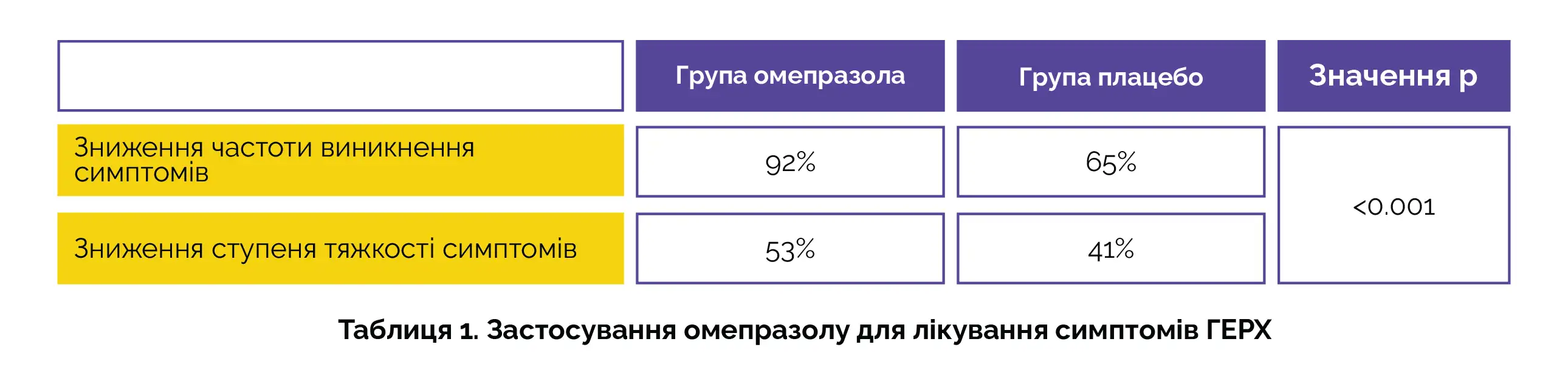 Мета цього дослідження полягала у вивченні ефективності інгібітору протонного насоса омепразолу щодо тривалості та частоти виникнення симптомів з боку шлунково-кишкового тракту (ШКТ) та впливу терапії на якість життя у пацієнтів з гастроезофагеальною рефлюксною хворобою (ГЕРХ).