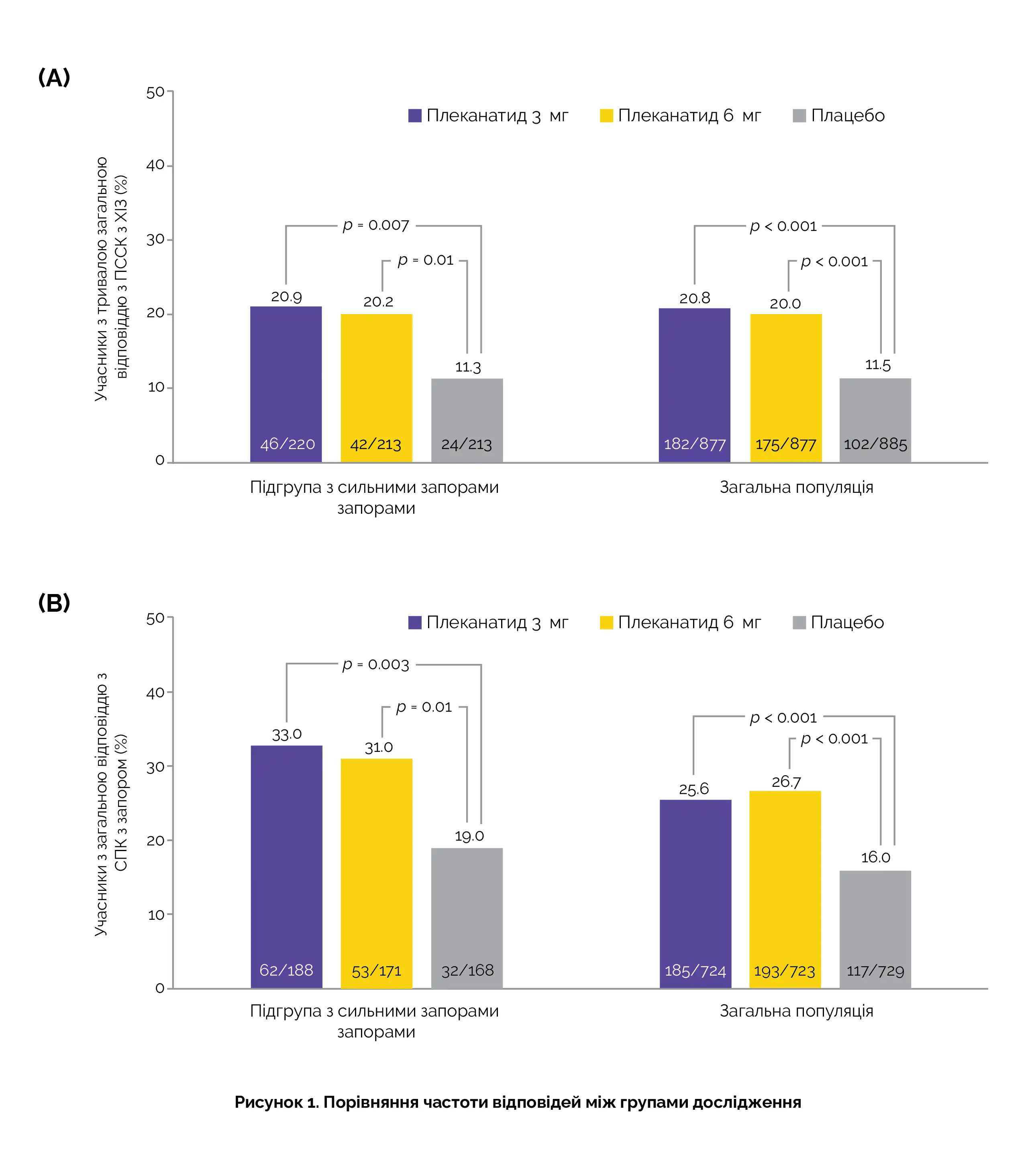 Сильні запори були виявлені у 24,5% пацієнтів у групі ХІЗ (646 із 2639 осіб) та у 24,2% у групі СПК із запорами (527 із 2176 осіб). У обох популяціях, ХІЗ і СПК із запором, спостерігалася значно вища частота відповіді на терапію плеканатидом проти групи плацебо (рисунок 1).