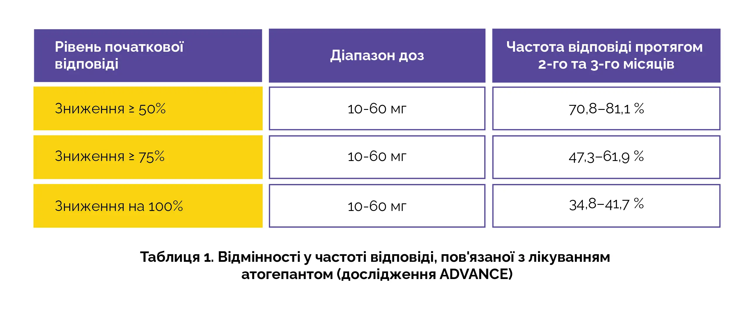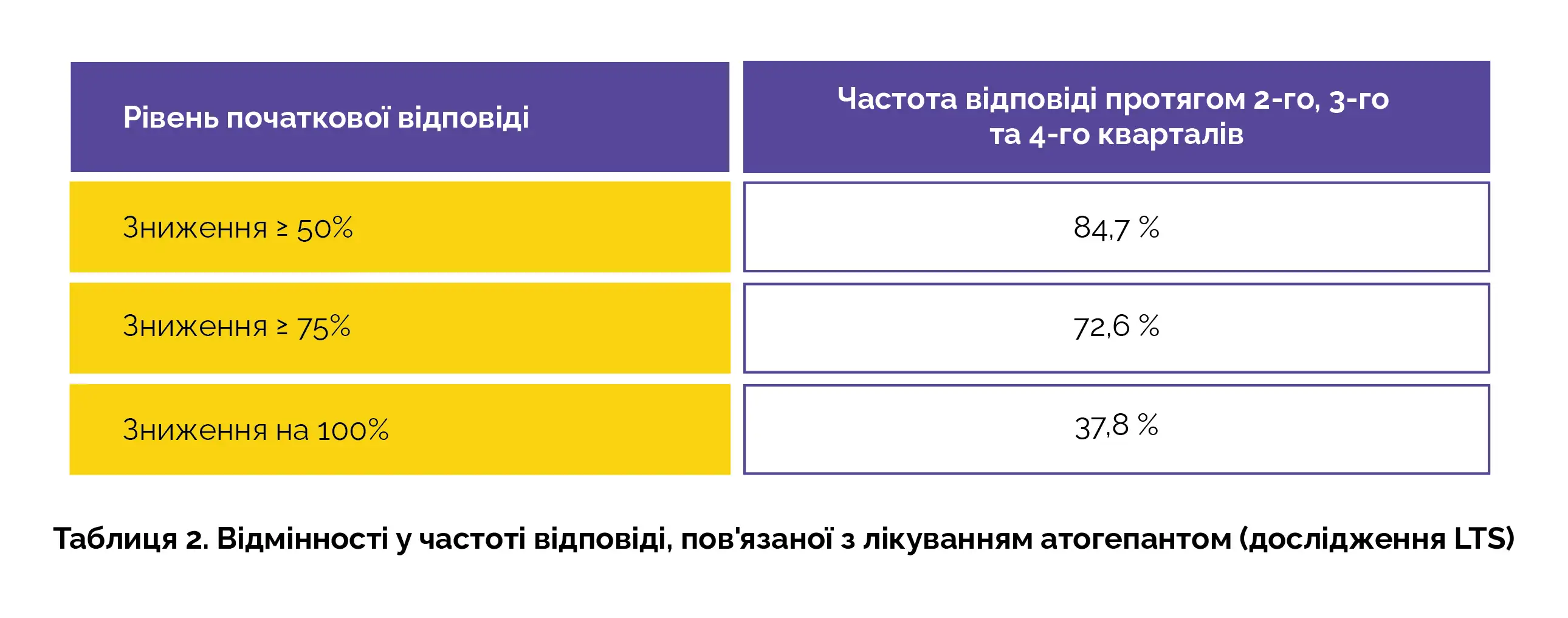 У понад 70% учасників, які спочатку відповіли на лікування атогепантом, зберігалася довгострокова ефективність при продовженні його застосування.