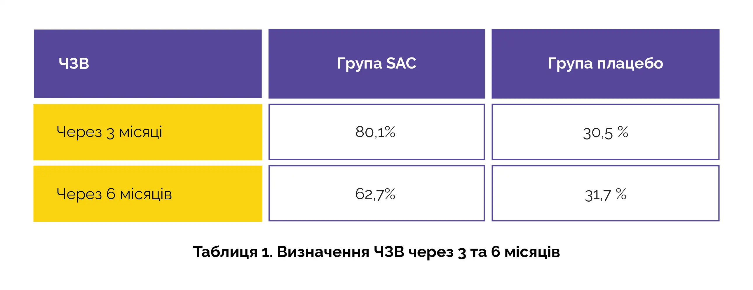 З 241 жінки у групі SAC та 82 у групі плацебо 217 (90,0 %) та 71 (86,6 %) відповідно завершили дослідження. Через 3 і 6 місяців частота загальної відповіді (ЧЗВ) по відношенню до дисменореї була значно вищою у жінок, які приймали SAC, порівняно з плацебо (див. таблицю 1).