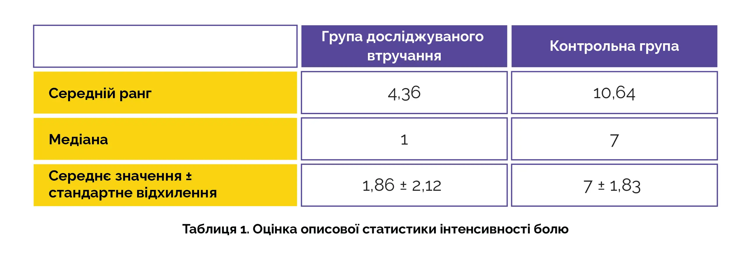 У контрольній групі медіана становила 7 (діапазон 5-10, середнє значення 7 ± 1,83). Цей результат був вищим, ніж у групі досліджуваного втручання, де медіана склала 1 (діапазон 0-6, середнє значення 1,86 ± 2,12). Згідно з U-критерієм Манна-Уітні, середній ранг у контрольній групі перевищував середній ранг у групі досліджуваного втручання. Ця відмінність була статистично значущою, як показано в таблиці 1.