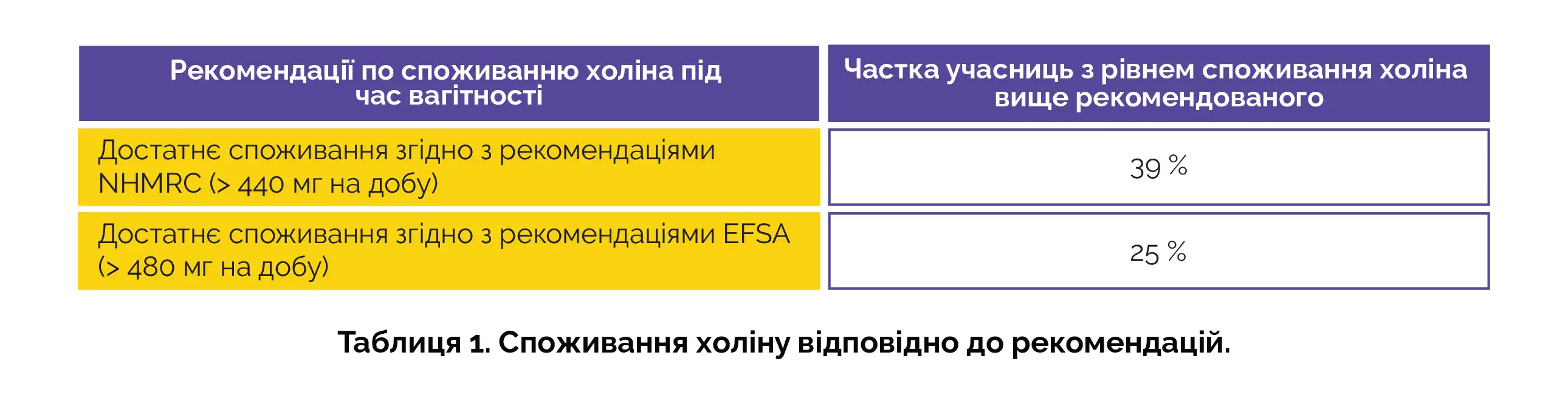 Рівні споживання та джерела холіну на ранніх та пізніх термінах вагітності були порівнянні. Споживання холіну на ранніх термінах вагітності становило в середньому 362 мг на добу. Частка жінок (%), у яких споживання холіну під час вагітності перевищувала рекомендоване Австралійською національною радою з охорони здоров'я та медичних досліджень (NHMRC) та Європейським агентством з безпеки харчових продуктів (EFSA), наведено нижче (таблиця 1):