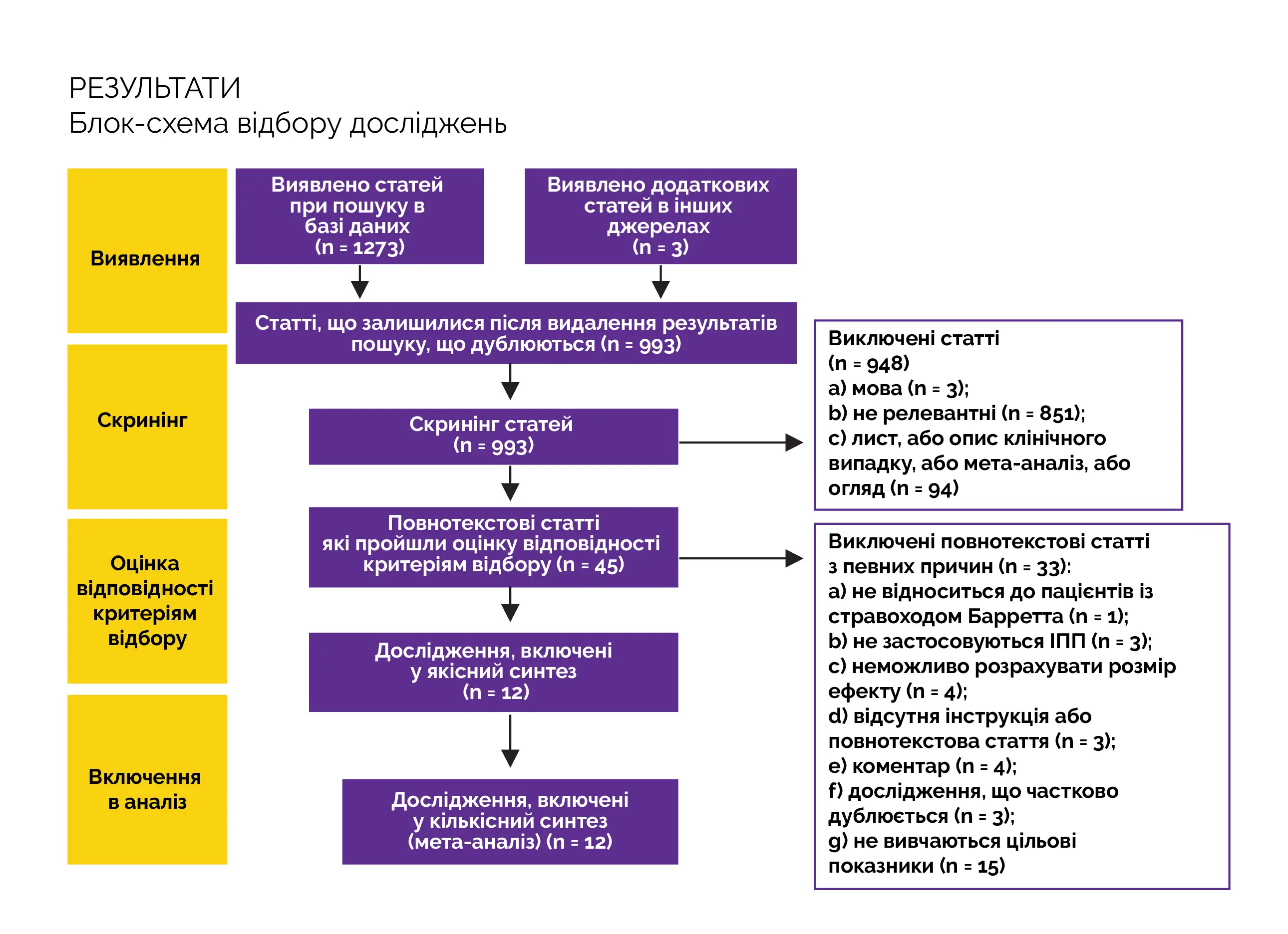 Після виконання пошуку в електронних базах даних було виявлено 1276 статей. Після видалення статей, що дублюються, і вивчення назв і анотацій було відібрано всього 994 потенційно релевантних дослідження. Критеріям включення відповідали 12 досліджень із 45. Вилучення даних та вивчення повнотекстових статей було проведено двома експертами незалежно один від одного з урахуванням критеріїв включення та виключення.