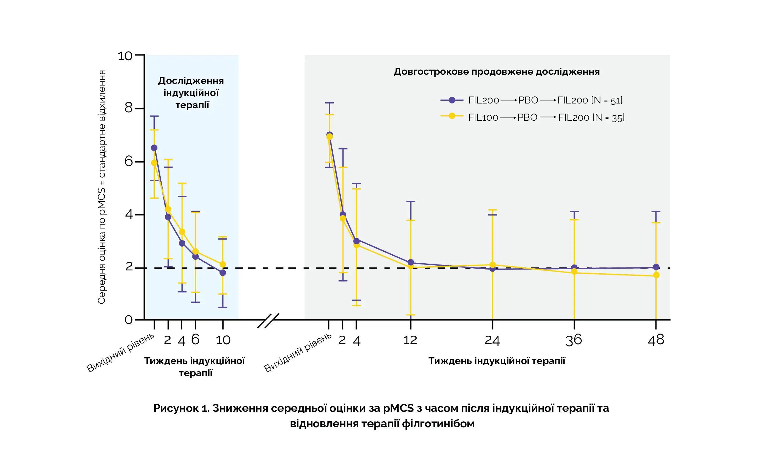 До аналізу було включено 86 пацієнтів (FIL200: n = 51; FIL100: n = 35). Середній часовий інтервал до погіршення стану після відміни лікування склав 15,1 тижня (95% довірчий інтервал (ДІ): 9,1–18,7 тижня) у пацієнтів, які спочатку отримували FIL200, та 9,6 тижня (95% ДІ: 6,3–12,0 тижня) у пацієнтів, які отримували FIL100. Згідно з оцінкою pMCS, 75% учасників в обох групах досягли відповіді протягом 4-5 тижнів після відновлення терапії. До кінця 48-го тижня ремісію з оцінки pMCS було досягнуто у 45,1% пацієнтів, які отримували FIL200, і 51,4% пацієнтів, які отримували FIL100 (див. малюнок 1).