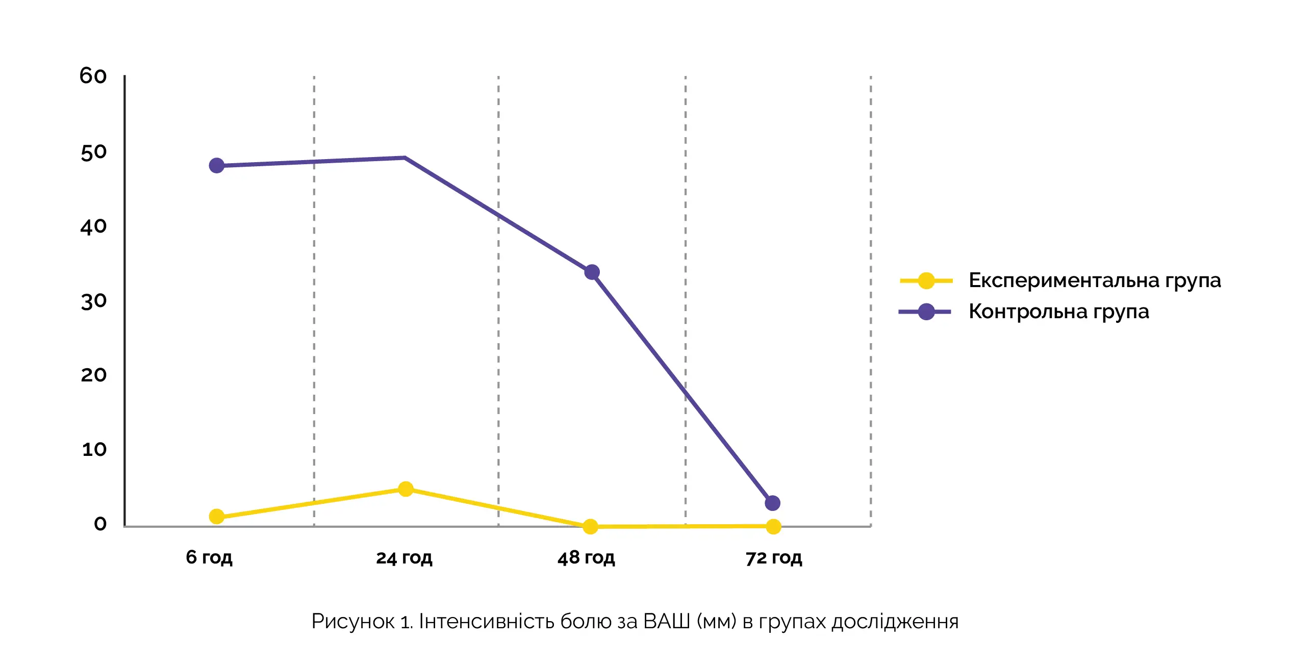 Порівняно з контрольною групою, в учасників з експериментальної групи об'єктивна інтенсивність болю через 6, 24 та 48 годин, а також суб'єктивна тяжкість болю при оцінці її сприйняття учасниками на піку, у фазу зниження та зникнення була статистично значуще нижчою.