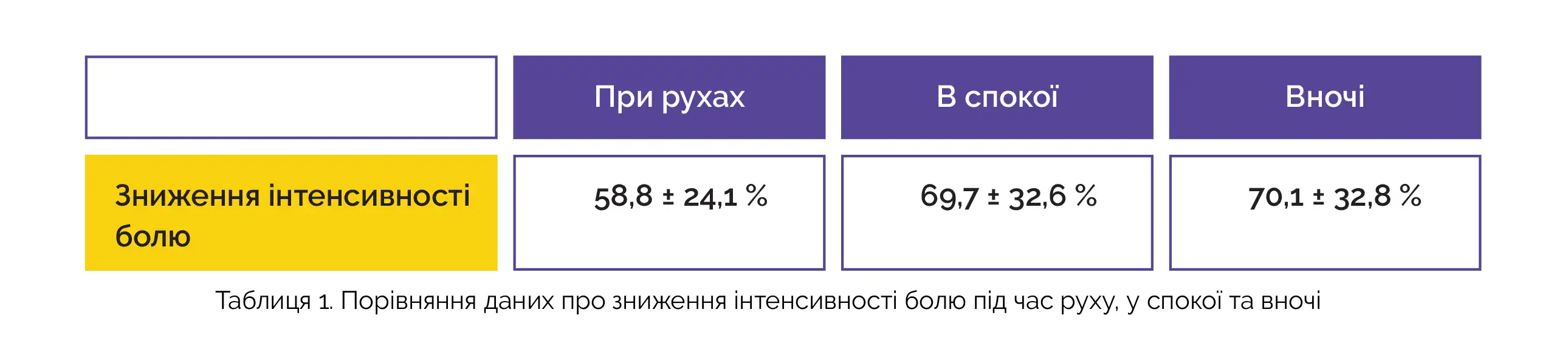 Інтенсивність болю під час руху, у спокої та вночі через 2 тижні лікування еторикоксибом знизилася (див. таблицю 1).