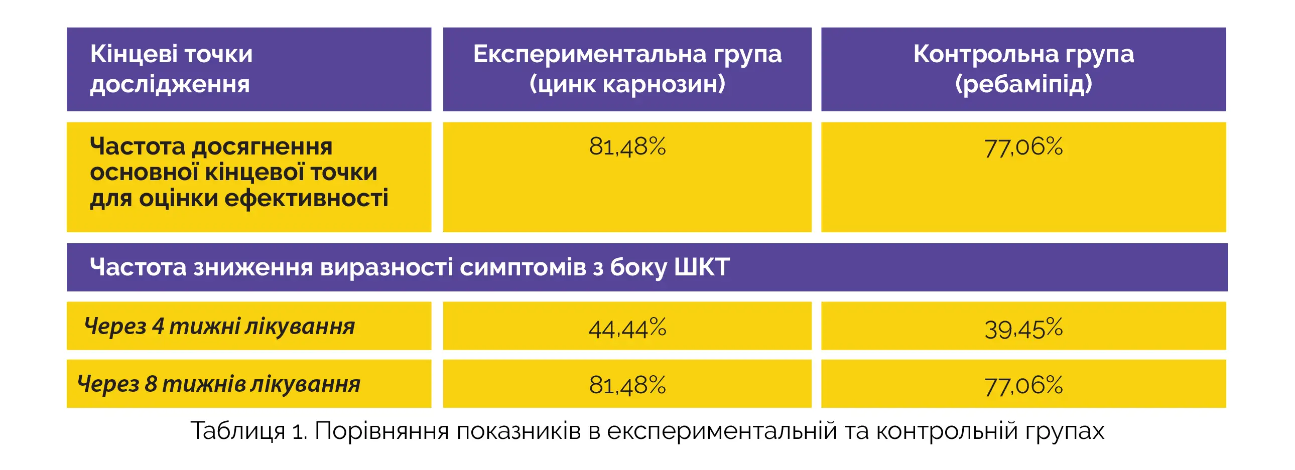 Застосування цинк карнозину в гранулах забезпечує подібний терапевтичний ефект у пацієнтів з виразковою хворобою шлунка порівняно з препаратами, що широко призначаються, для лікування цього захворювання в клінічній практиці.