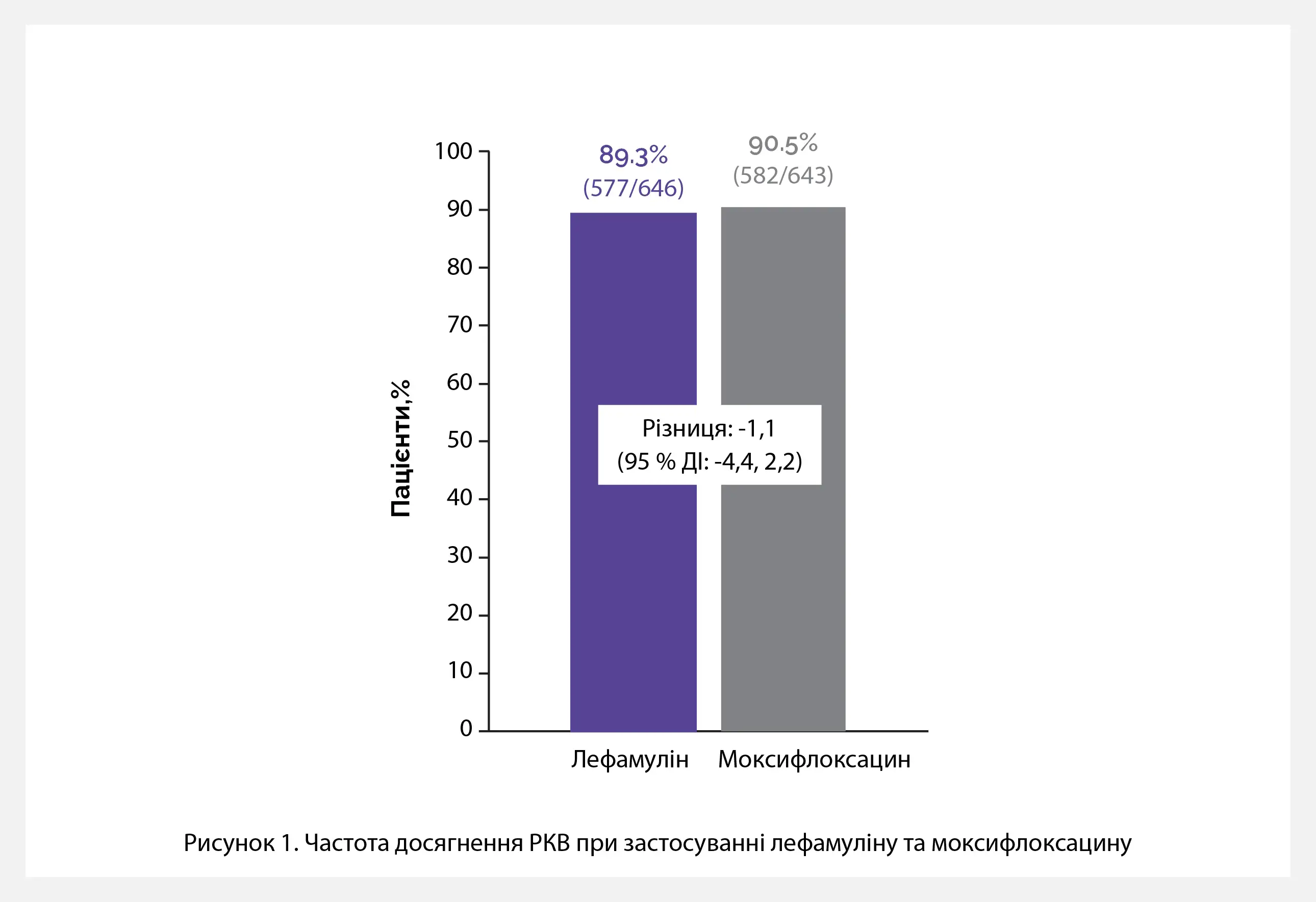 До групи застосування лефамуліну було включено 646 пацієнтів, а до групи застосування моксифлоксацину – 643 пацієнти. За результатами оцінки РКВ лефамулін не поступався ефективності моксифлоксацину (див. рисунок 1).